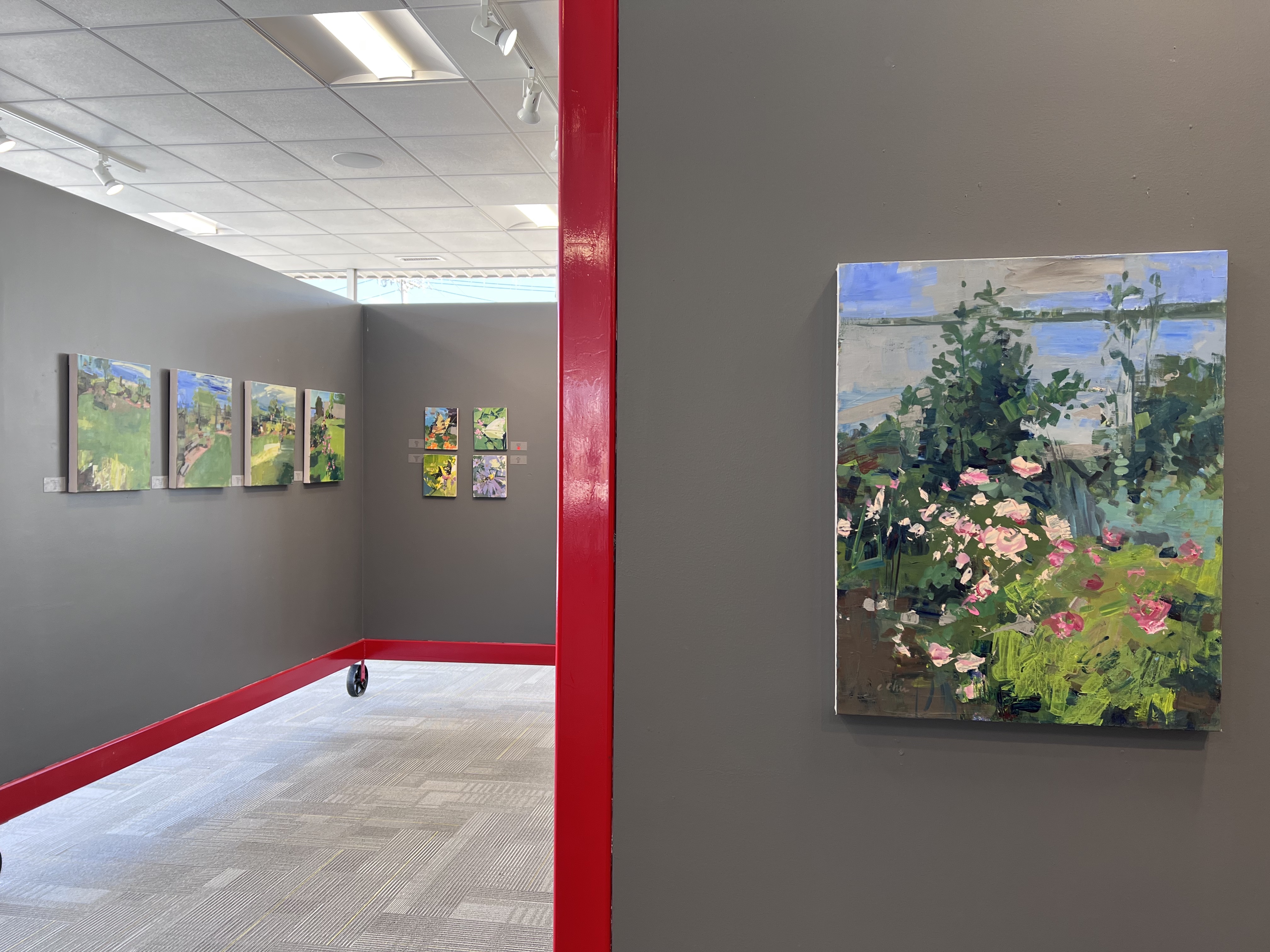 These qualities come across in all the paintings Chin displays in her Dryden Gallery exhibition. Her ability to convincingly construct a morning glory, or a rose, or the shady details of leafy undergrowth with just a few darting movements of her brush is exemplary. With equal levels of giddy paint application and refined restraint, Chin creates decisive snapshots of her world.