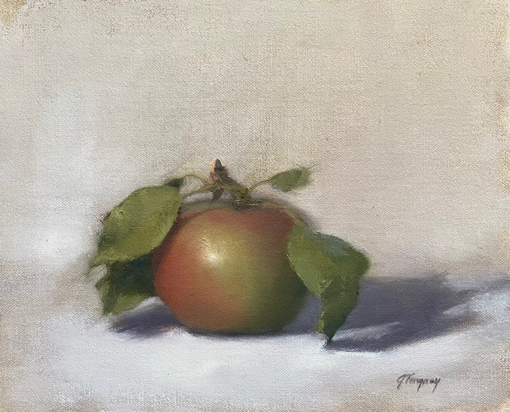 Another bright spot in the exhibition is Jeanne Tangney’s “Macintosh”. Although her chosen subject is a simple one, a lone apple against a neutral backdrop, her execution elevates this humble still life. Tucked under a tuft of leaves, the skin of Tangney’s apple subtly changes tone from red to green and glints with an eye-catching shine. Her treatment channels the mood of the great eighteenth-century French painter Chardin, who made studied quietude his metier. Tangney studied at Rhode Island College and has exhibited widely.
