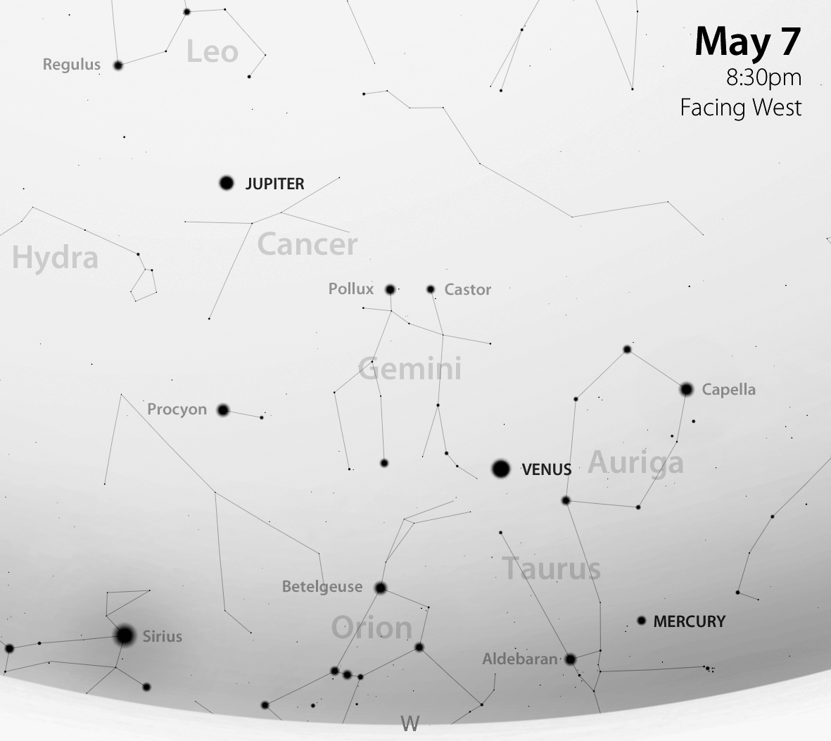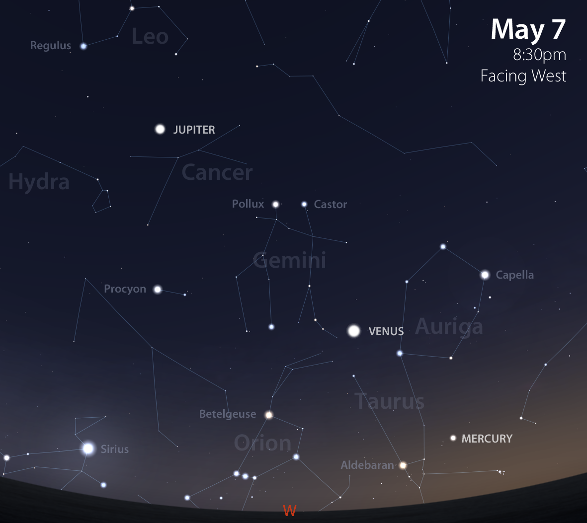 During the first few weeks of May you can catch a naked-eye view of Mercury. On May 1, if you have an unobstructed view towards the west-northwest, you will find our solar system’s closest planet to the Sun about ten degrees (a fist held at arm’s length provides this measurement) above the horizon after sunset. It will be just less than two degrees to the left of the Pleiades star cluster (Subaru symbol), and just about ten degrees to the right of the V-shaped Hyades cluster that forms the face of Taurus the Bull.