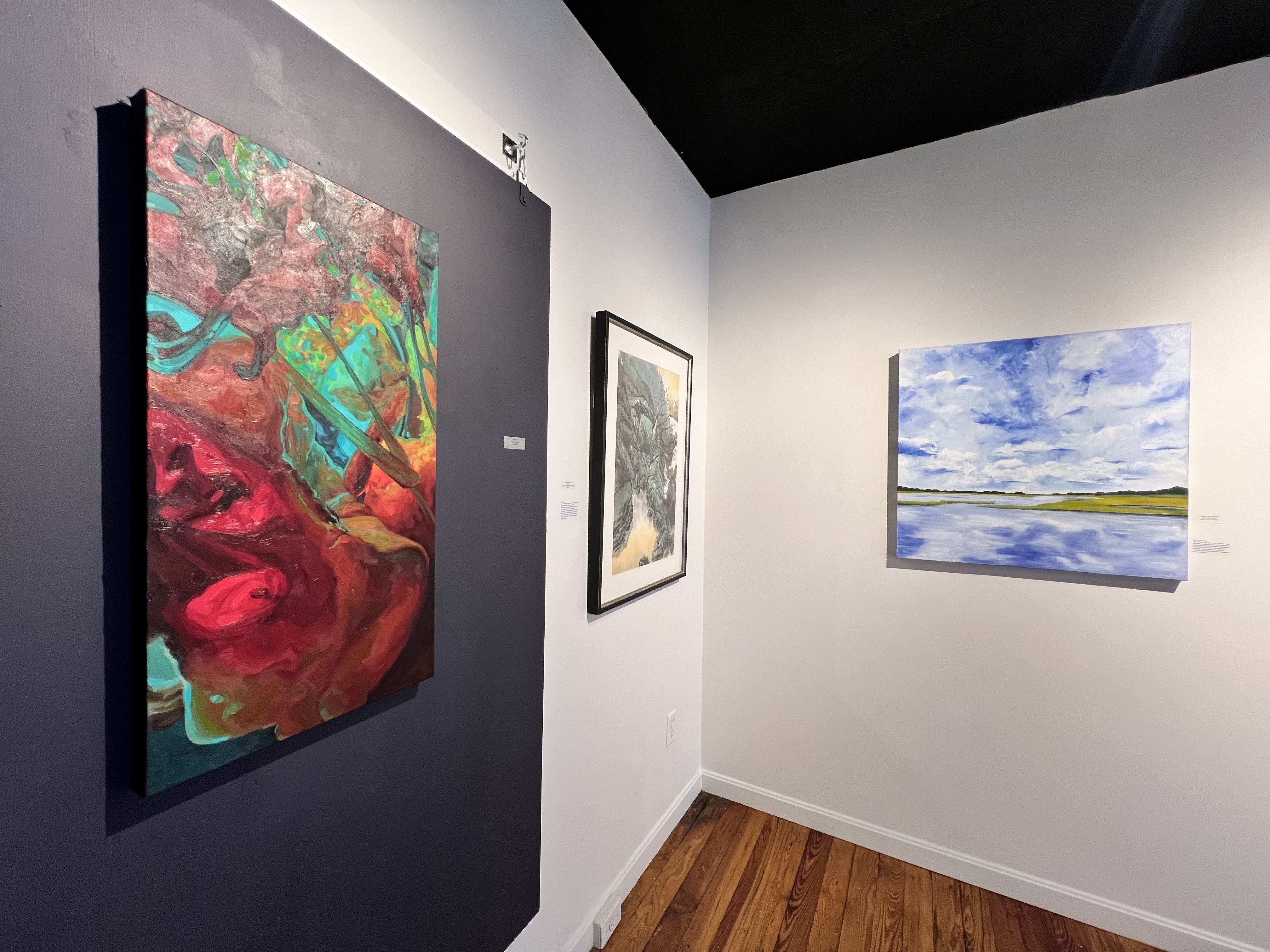 On Saturday, June 8, the show opened with a well-attended and festive reception that saw neighbors and artists intermingling amongst the artworks on view. This is the type of community-oriented programming that makes spaces like Imago special. It also means that residents of Warren and the East Bay can see new artworks close to home. Cash awards were presented to five artists. Photographers Eric Hovermale and Marc Jaffe earned honorable mentions. Third Place went to collage artist Sarah Daughn, Second Place to painter Susan Graseck, and First Place to photographer Dave Kendrick.