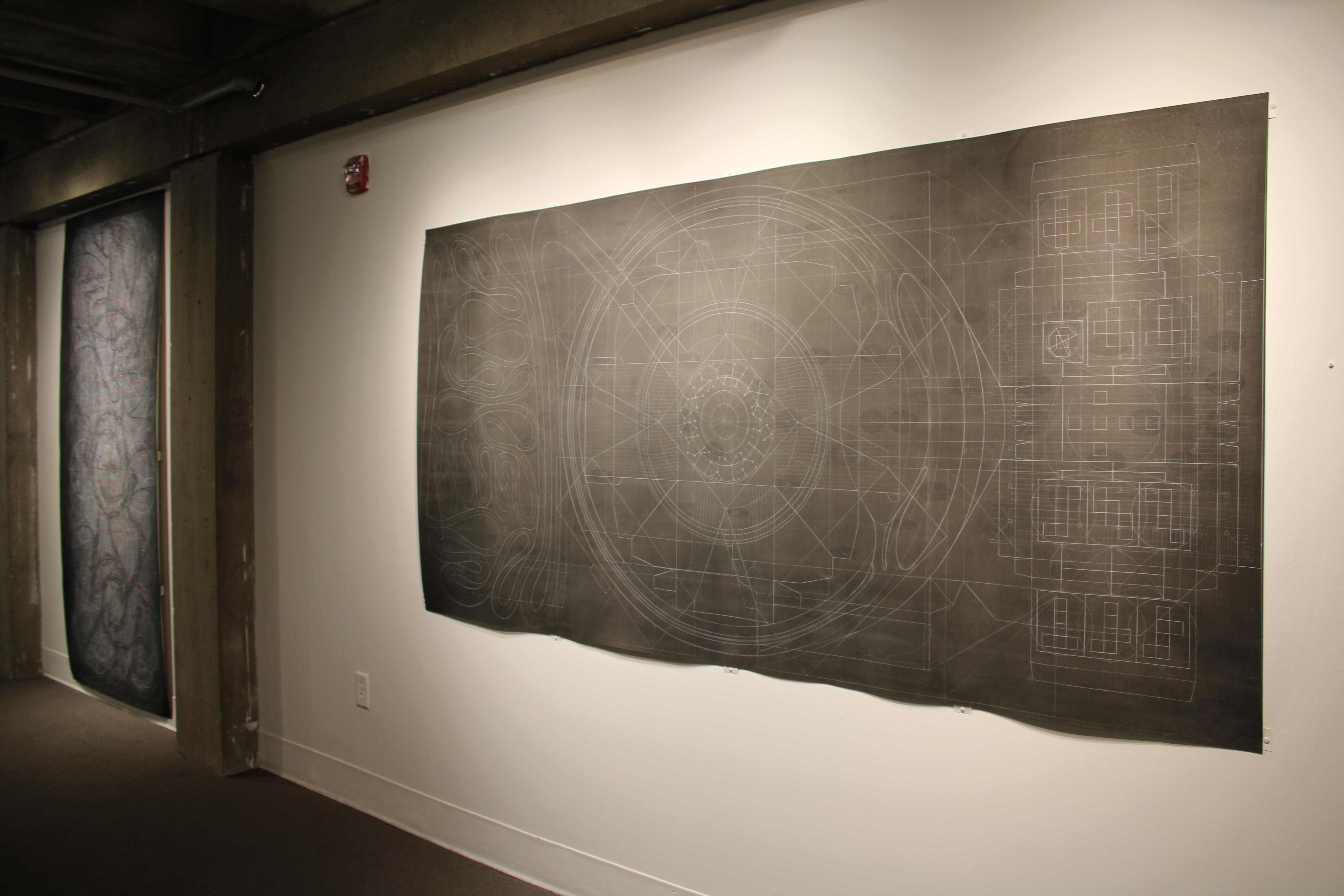 Horii’s deeply layered drawings overlap varying forms of diagrammatic imagery. The typical static found in technical or architectural schematics is flouted in Horii’s artworks, which are presented on paper that subtly puckers and waves. In Horii’s wall-length drawings, the trustworthy vocabulary of a blueprint is often subverted, making for enticing opportunities to reexamine ideas about how to read an image.