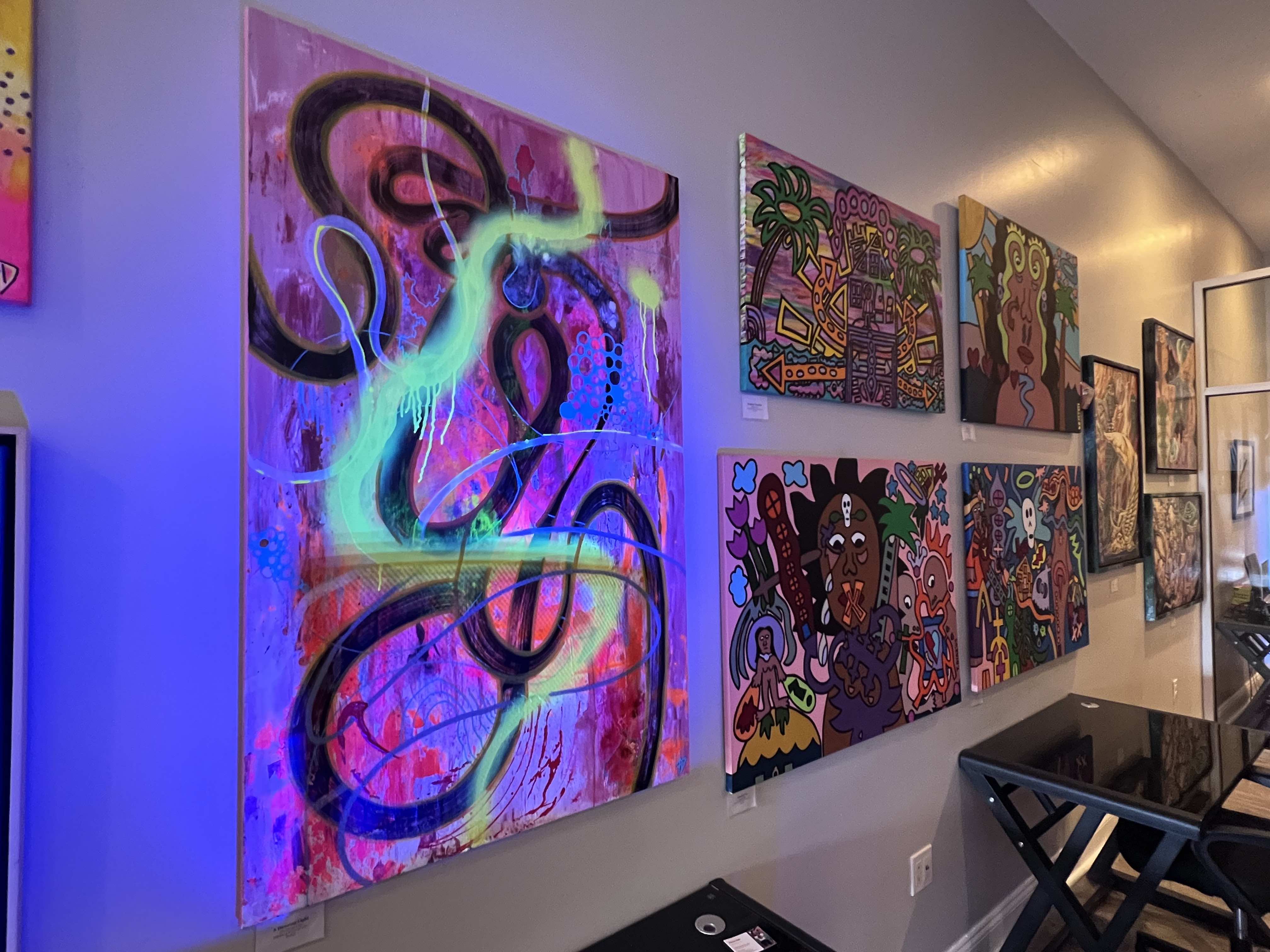 De La Cruz discusses a recent Art Night, saying, “I was so honored to be part of such an incredible event for a cause, while being put in a room with a bunch of extremely talented artists from RI as well. I brought my UV Blacklight and it was so exciting seeing the faces of everyone enjoying and interacting with my work. I've had the opportunity to talk with many attendees and they were willing to learn and pick my brain about my inspiration, and the creation processes of each composition. Their exchanges on how they connect with the pieces was extremely heartwarming. The room felt very supportive and it made me realize that this is why I create - to help people recall a special moment in their life that was moving for them.”