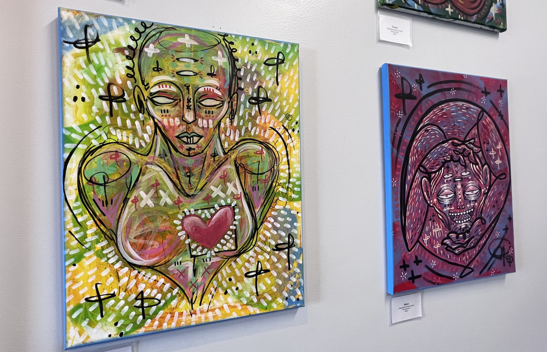 Twenty-five-year-old Fior De La Cruz is also currently featured. Like Hill, De La Cruz is self-taught. Her work is playful and often abstract. In addition to traditional painting techniques, she employs phosphorescent paint and UV light to make her paintings glow. This element brings her pieces to life within space and encourages audience participation.