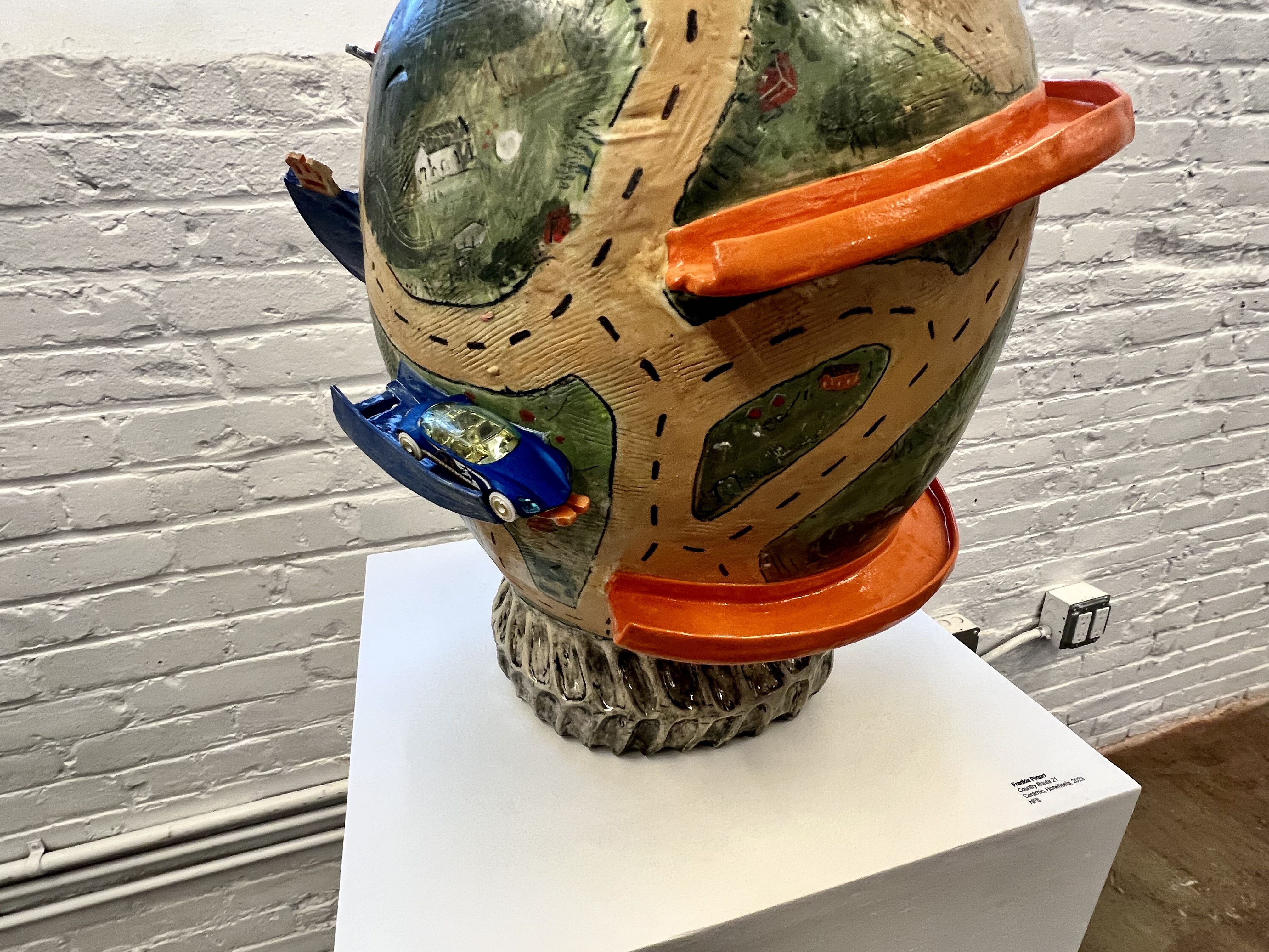 During a recent studio visit, Pittorf showed off finished pieces and works in progress. In one of their most ambitious projects, a large vase, ceramic Hot Wheels tracks criss-cross a painted map of the town in which they were raised making for a multi-layered experience. In another series of small but highly decorated vessels, Pittorf charts spaces and objects from their upbringing that relate back to their exploration of queerness. All of Pittorf’s work is imbued with a keen sense for expressive drawing, bright color, and adventurous experimentation.
