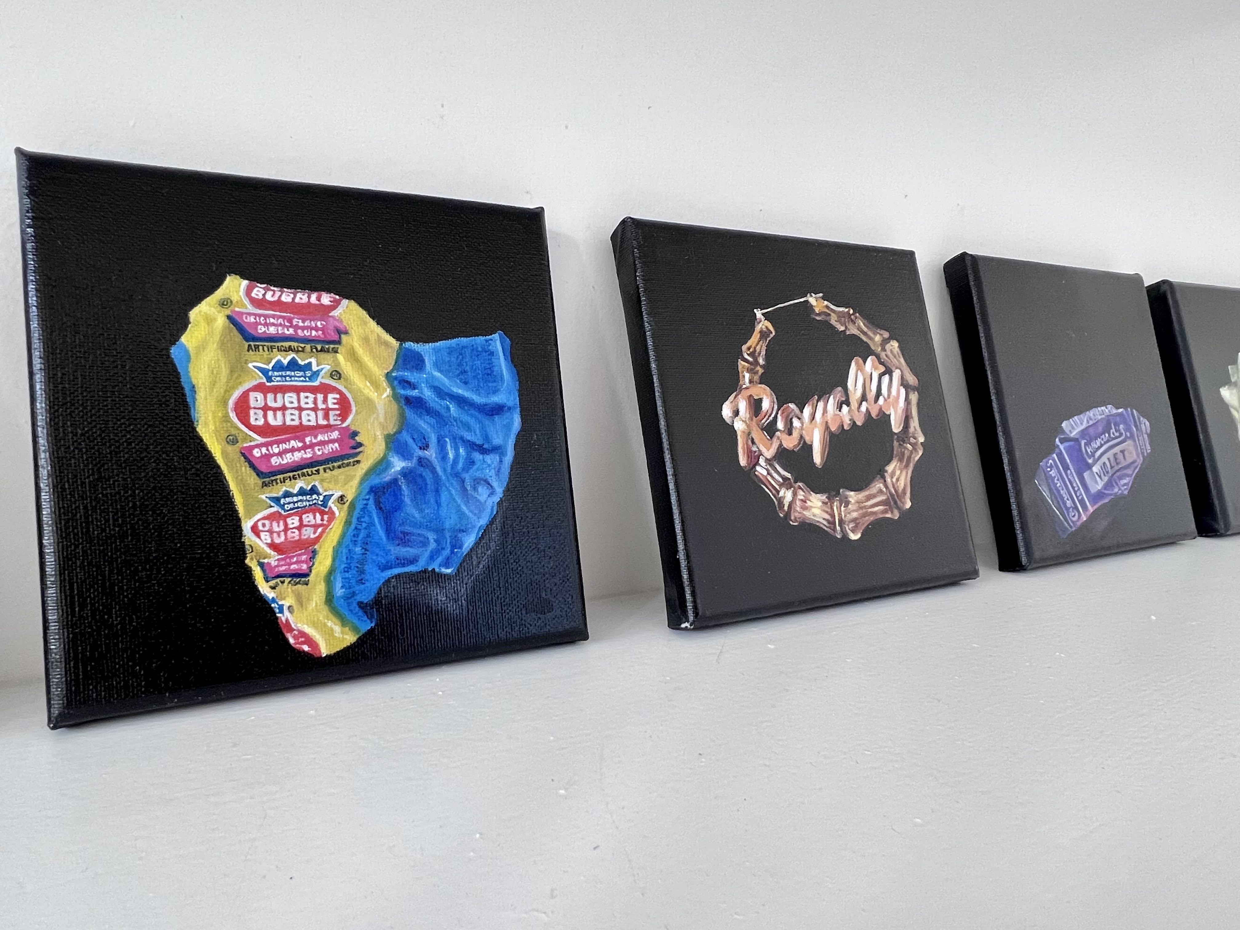 Beyond her familial portraits, Bryan is also showing a body of small paintings that focus on objects. Bubblegum wrappers, empty beer bottles, and crumpled cigarette boxes are some of the subjects. The scale of these pieces draws in the eye and invites the viewer to look closely in order to better appreciate Bryan’s adept skill for capturing tiny details.