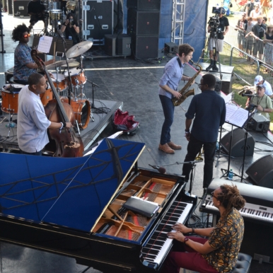 Trumpter Ambrose Akinmusire is a rising star in the jazz world. He christened the Quad Stage with his quartet Friday opening with "Roll Call for Those Absent." His set included covers and originals like "As We Fight." (Photo: Ken Abrams)