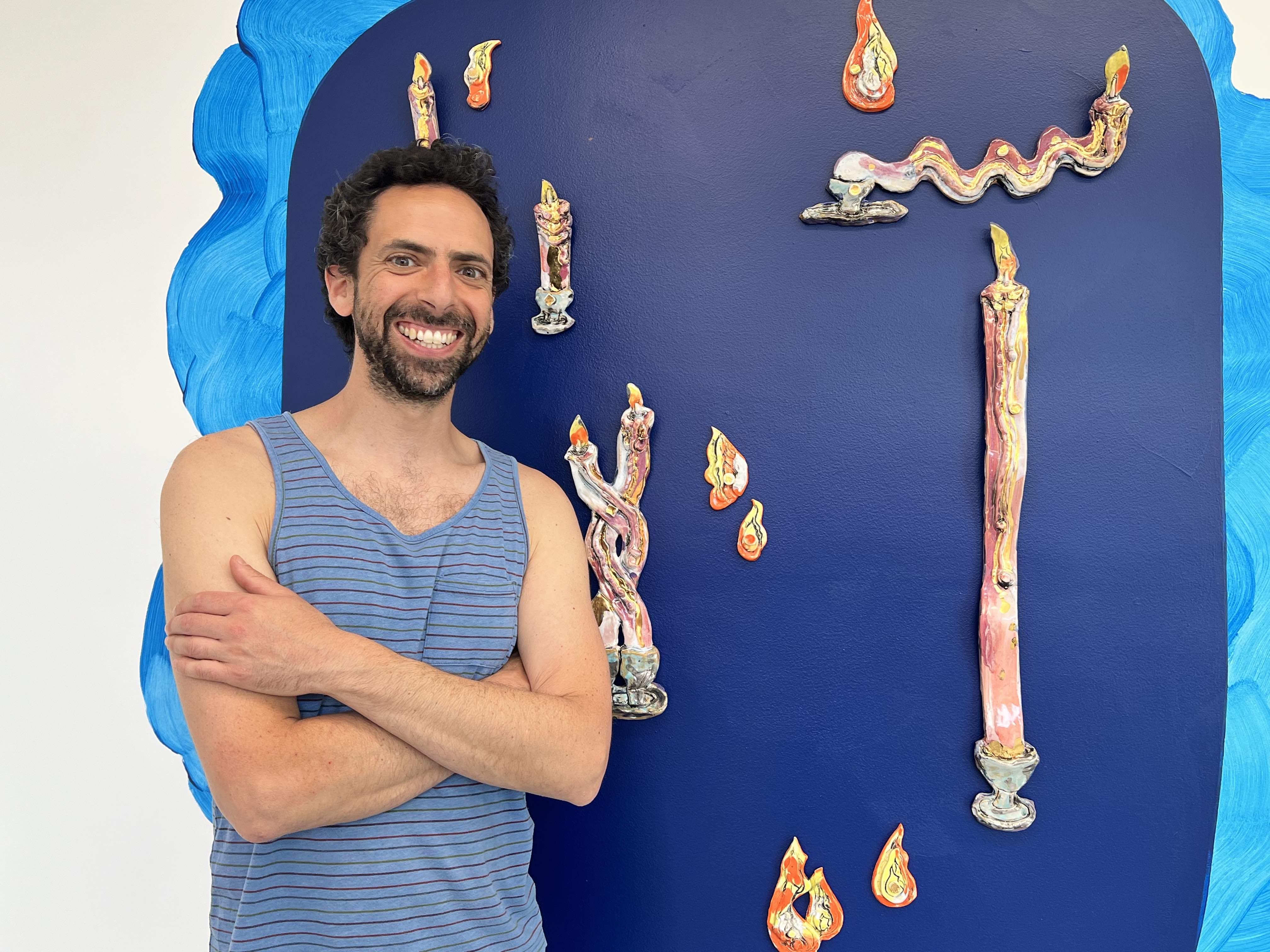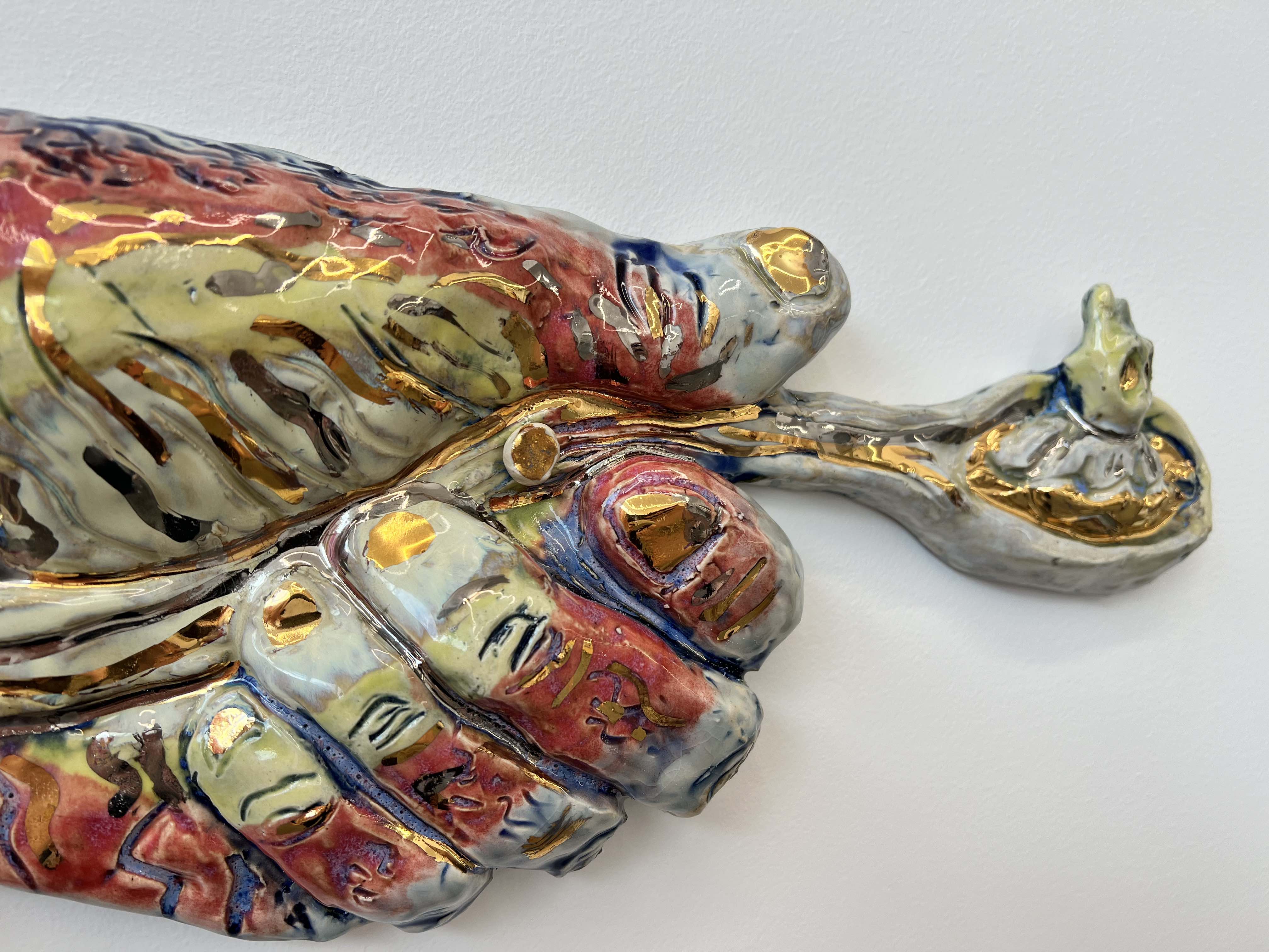 In his work on view at Overlap, there is a sense of play and experimentation as well as an obvious mastery of materials. Richly textured reliefs are treated sensitively with subtle glazes that pool in lovely ways. Schiffman brings astute attention to detail to even the smallest elements of his work. For instance, magnets encapsulated in clay and glazed with glittering gold luster are used to cover the screws used to mount the work to the wall. Characters and forms, both recognizable and more obscure, dance around the room. Recurring motifs include candles, eyes, as well as ambiguous creatures and animals. The work is enjoyable to explore, and this multi-part installation invites that exploration.