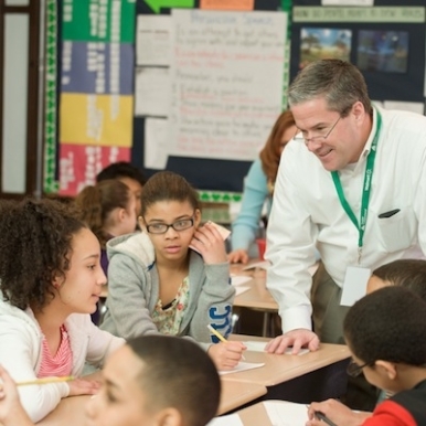 President & CEO of The Rhode Island Foundation, Neil Steinberg, with some students from his JA Our Nation class. In JA Our Nation, students learn that businesses are actively seeking workers with skills in science, technology, engineering, and math (STEM).