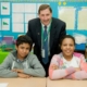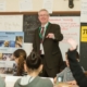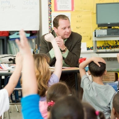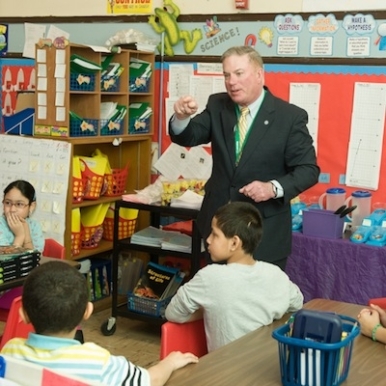 Cranston Mayor Allan Fung, works with first graders explaining the roles people play in the local economy as part of the JA Our Families program.