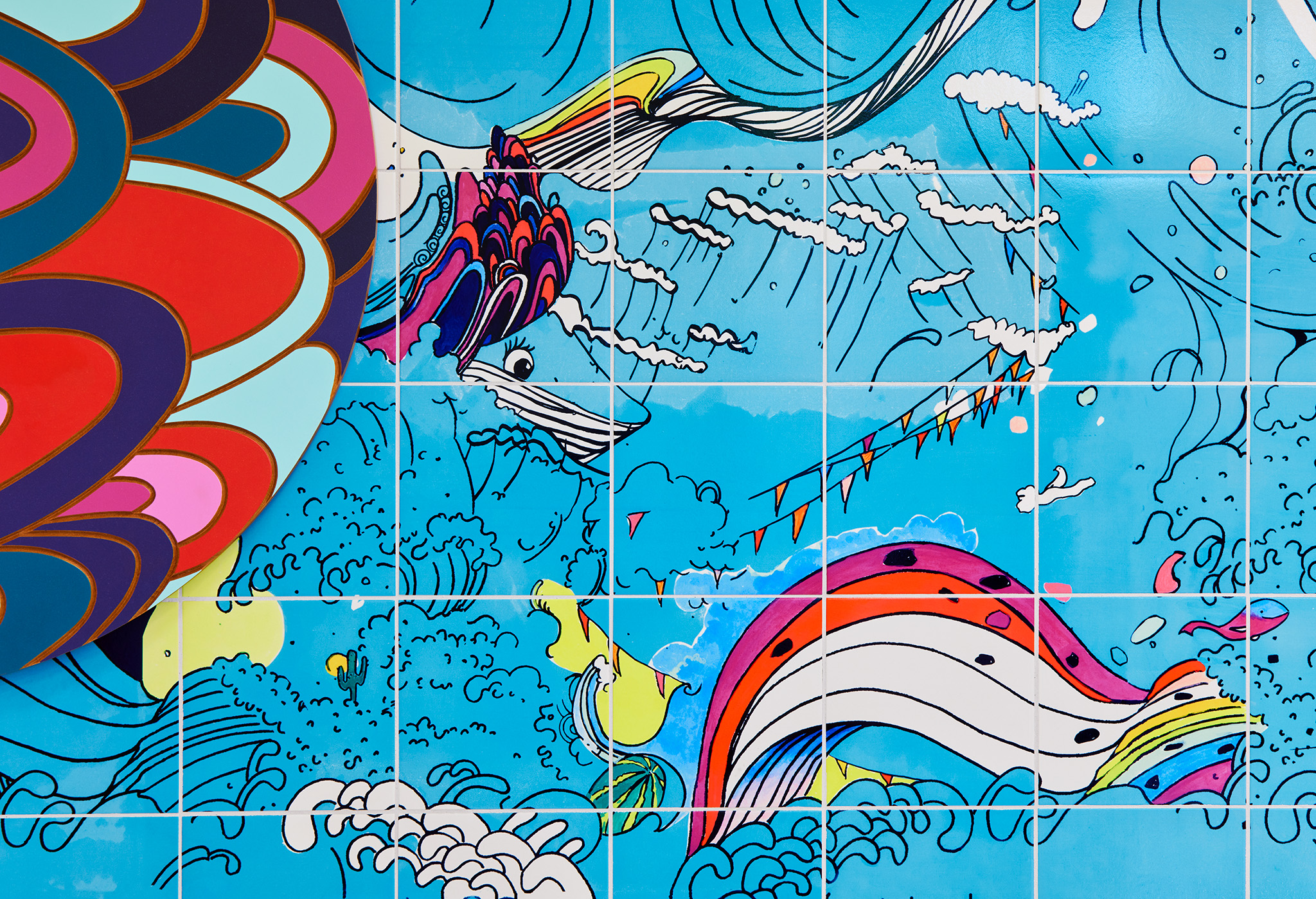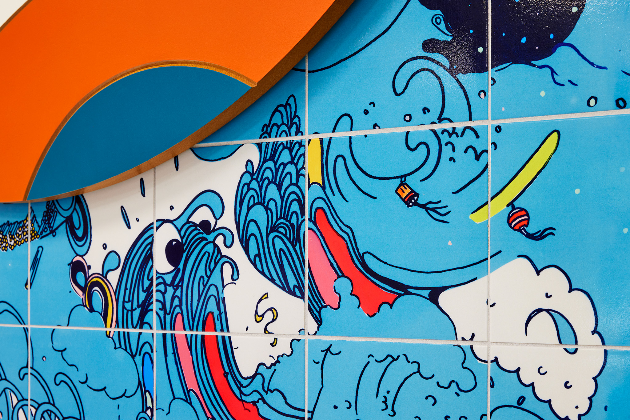Primarily a printmaker, Bianco has shared her works on paper in numerous exhibitions across the country and internationally. Her new public art project in Brooklyn is a departure in medium but carries with it many of her recognizable themes. Describing the public art program and explaining the process behind her latest work, Bianco says, “Curious Tide is my first public art commission for P.S. 958 Brooklyn, through the New York City School Construction Authority, Public Art for Public Schools program. The program is great for artists who haven't previously worked on a larger scale because there is support from the program, via panels, directors and a project manager who can guide the translation of a medium like printmaking into new materials. For this project, my original screen prints were digitized locally at io Labs, and then printed onto porcelain at a tile company in Missouri. The mahogany suns were fabricated in the studio of local artist Ben Watkins.”