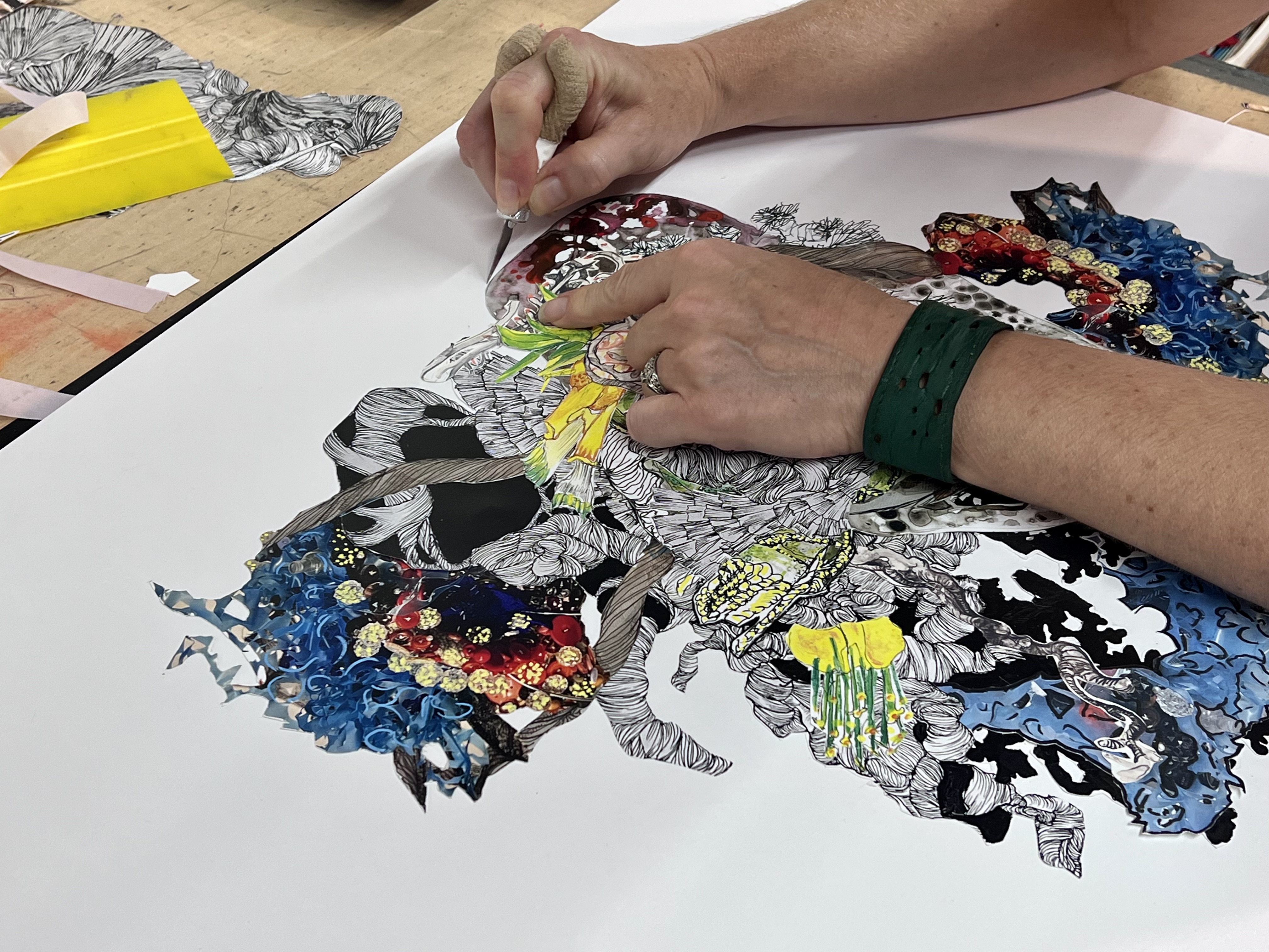 Considering the question of what she hopes viewers experience when seeing her work on view at Overlap, Renadette responds, “I make my tangled sculptures from salvaged commemorative and celebratory items, mixed with familiar textures, textiles, and objects, in order to suggest an interconnectivity between peoples' lives. These intricate arrangements are invitations to look deeper, and reflect on our internal and external experiences. With our collaborative work, I hope that viewers might feel like they've just been immersed in a garden that is both tended and growing wild in sections - hopefully, it feels like an environment of discovery and new possibilities.”