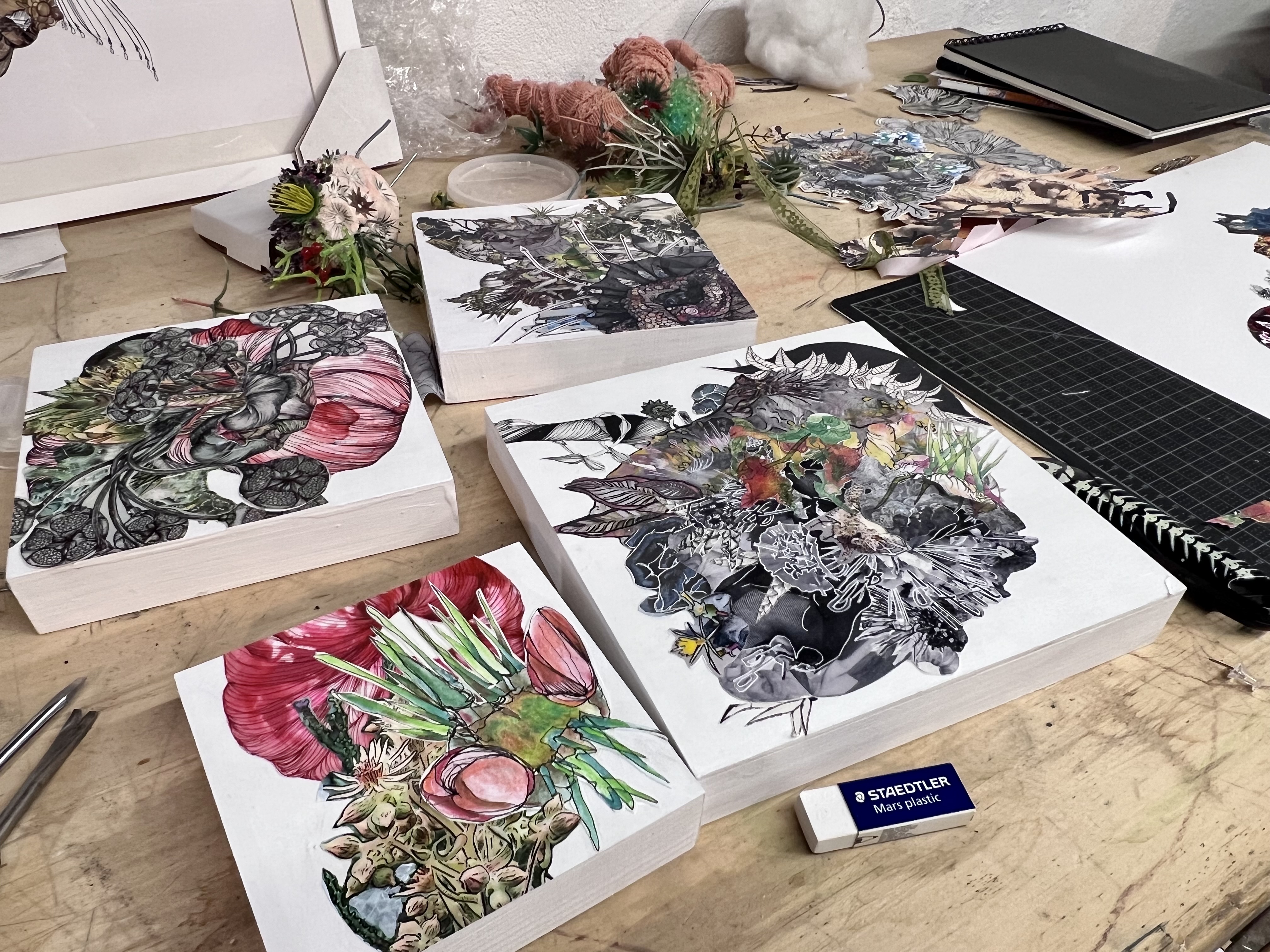 The energy that has invigorated Renadette’s practice is evident in her studio, which is packed full of recently finished pieces for her exhibition. The collection, which has taken about a year to complete, is full of the kind of enjoyable fastidiousness that defines Renadette’s aesthetic. Her assemblages and collages entice the eye to return again and again.