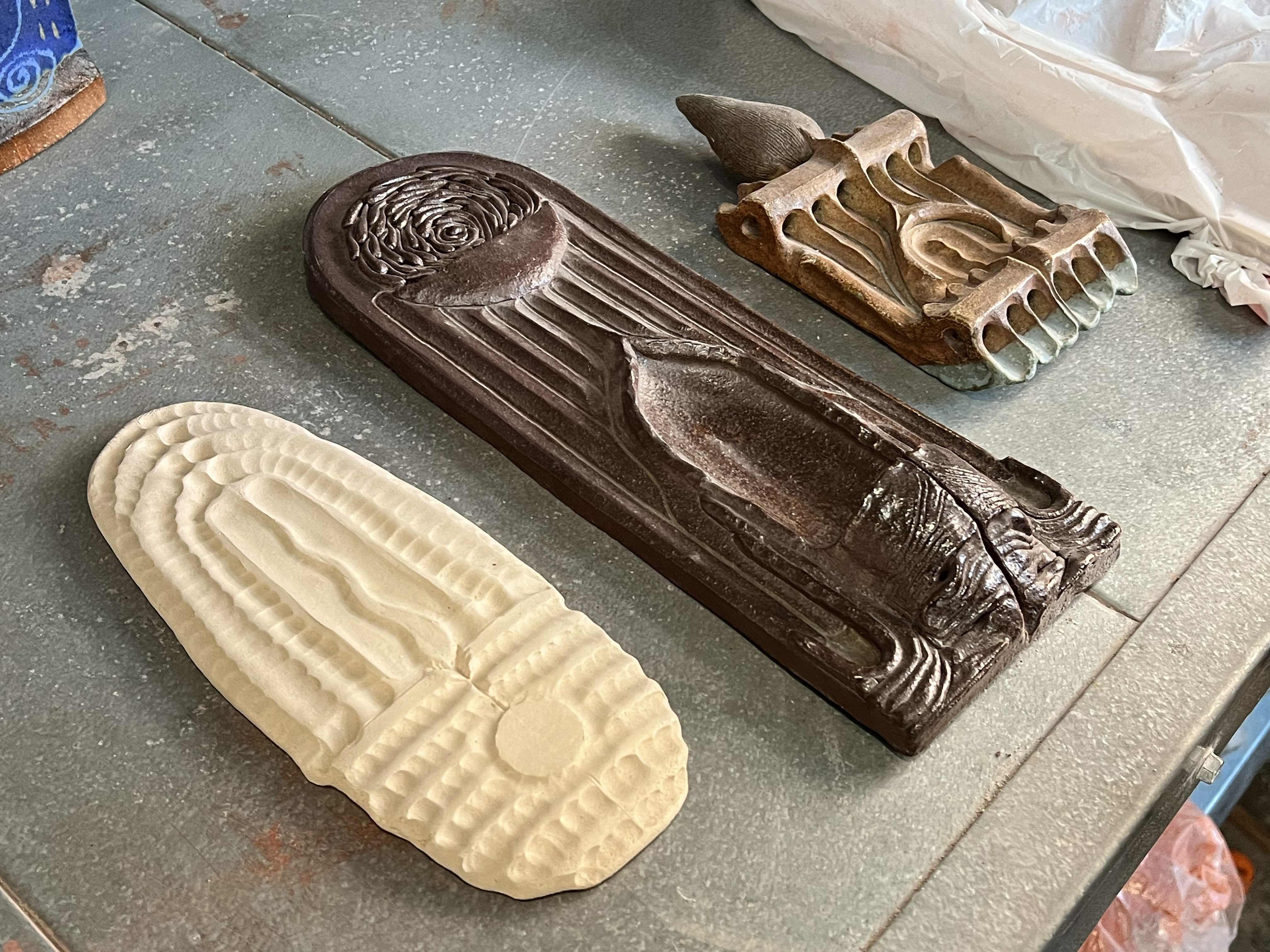 Cassell’s exploration of different techniques has been enhanced by her association with The Steel Yard, where she is a second year resident focused on ceramics. On a recent visit to Cassell at the Providence industrial arts hub, the artist showed off her neatly organized resident’s station filled with the materials needed to craft her ceramic artworks. Shelves in her studio cubby are lined with carefully labeled containers for glazes, and ceramics in various stages of completion are also on display. On a nearby shelf, recognizable forms await firing and glazing.