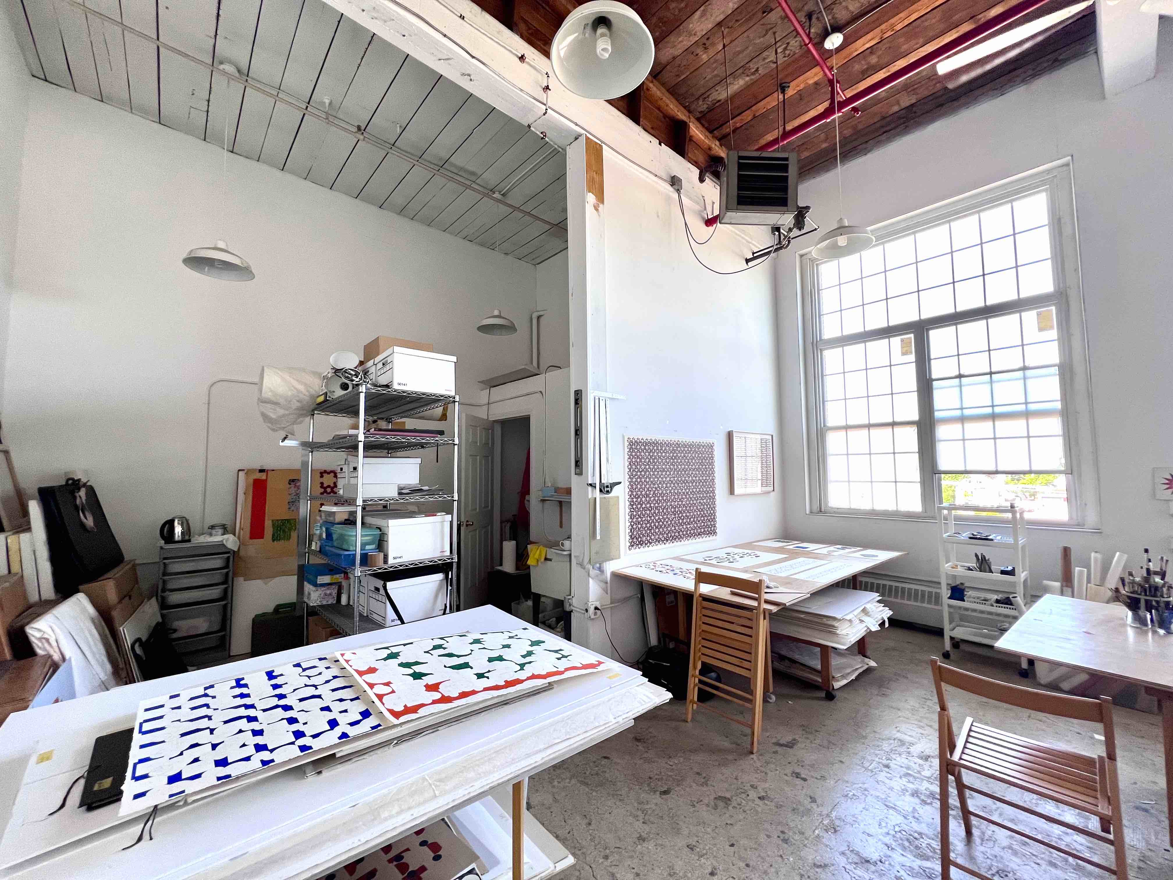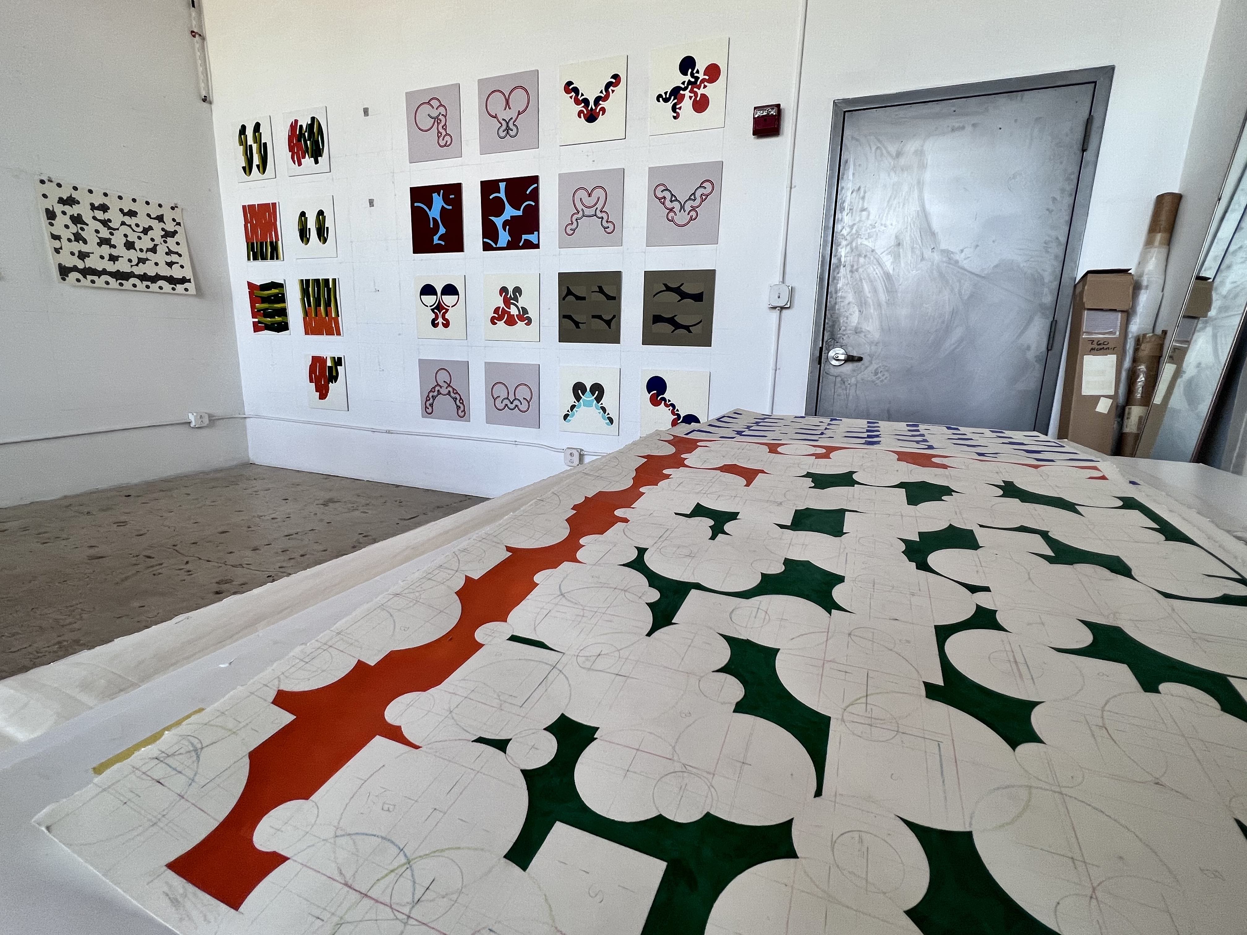 At her studio in a high-ceiling mill on the Providence-Pawtucket line, Ott regularly works to create new paintings that examine her deeply-held interests like pattern, time, and color. She has been working in the same space for over twenty years and her small array of creative tools includes expected things like brushes, palette knives, alongside straight edges, a well-used protractor, and a heat gun. As far as studios go, Ott’s is immaculately neat and tidy, a compliment to her precise artworks.