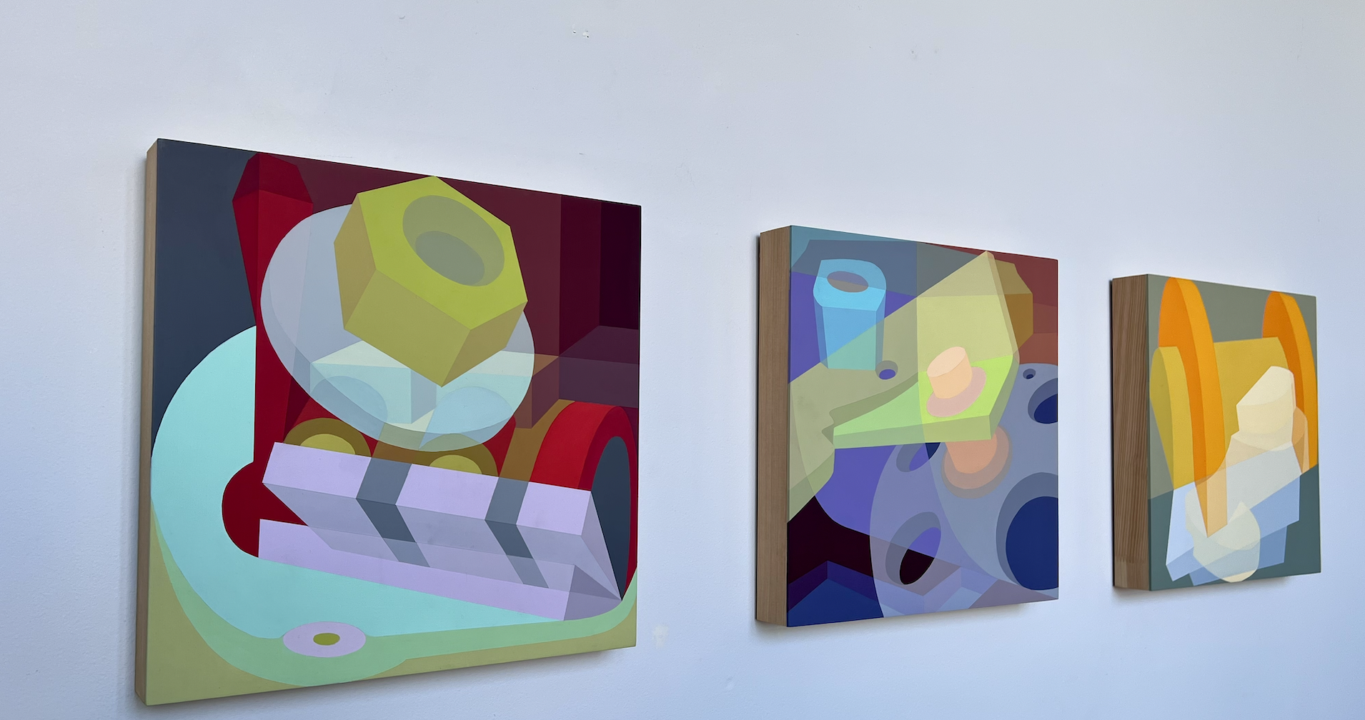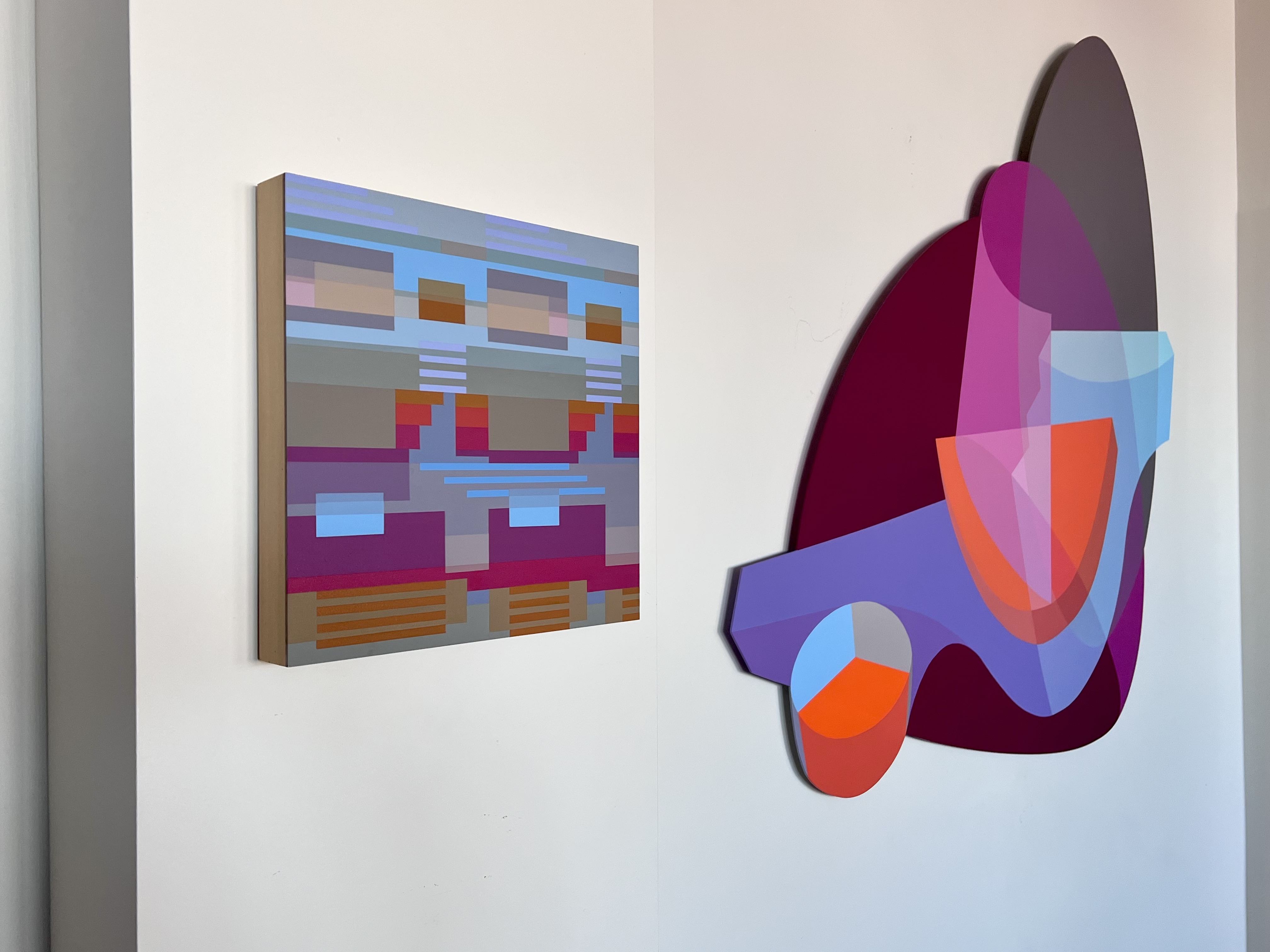 Speaking of her process, Hellman says, “When I broke my neck 18 years ago, I had to completely rethink my physical approach to making work. I started back using colored pencils, a straight edge and Canson Mi Teintes toned paper. By the time I moved to Providence in 2012, I had regained enough upper body mobility to use paint, so I began making small paintings on birch panels, taping edges and applying multiple flat coats of acrylic colors. Doing larger work has become possible, but I continue to use a straight edge, tape, plus a ship’s curve, and apply paint the same way. All my work begins with a line drawing, the reading of which is ambiguous. It is only with the development of color that I discover where it is headed.”