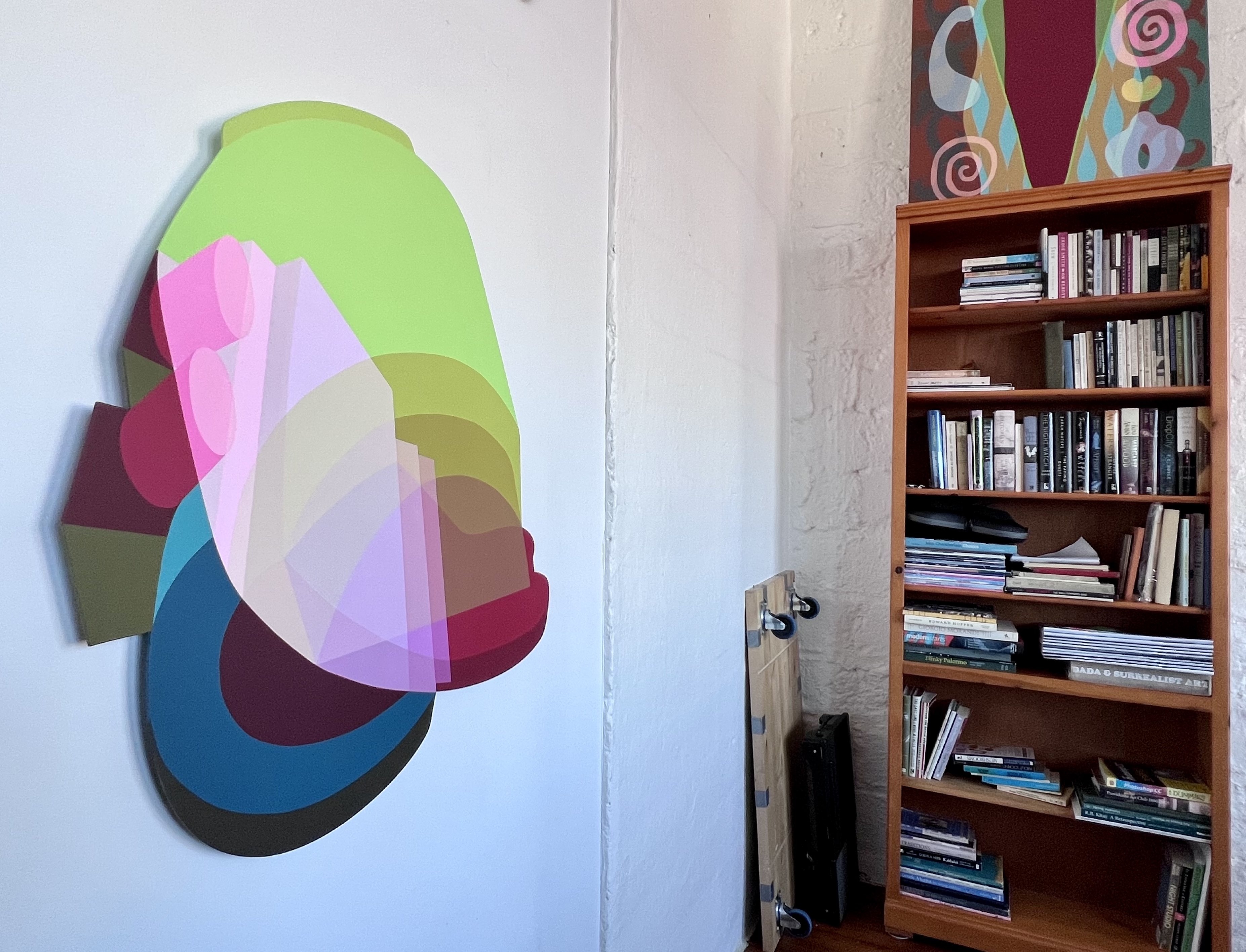 Hellman explains this period of her work, saying, “As a system emerged in my drawing for discovering a vocabulary of shapes and forms, I began to see compositions complete themselves without solving to the rectangle. I found that aluminum composite material for large paintings and aluminum blanks for smaller pieces could be precisely cut using a router or laser cutter. What especially appeals to me about the shaped perimeter is that my paintings take on an object quality, altering the notion of picture plane. I like the way they hold the wall.”