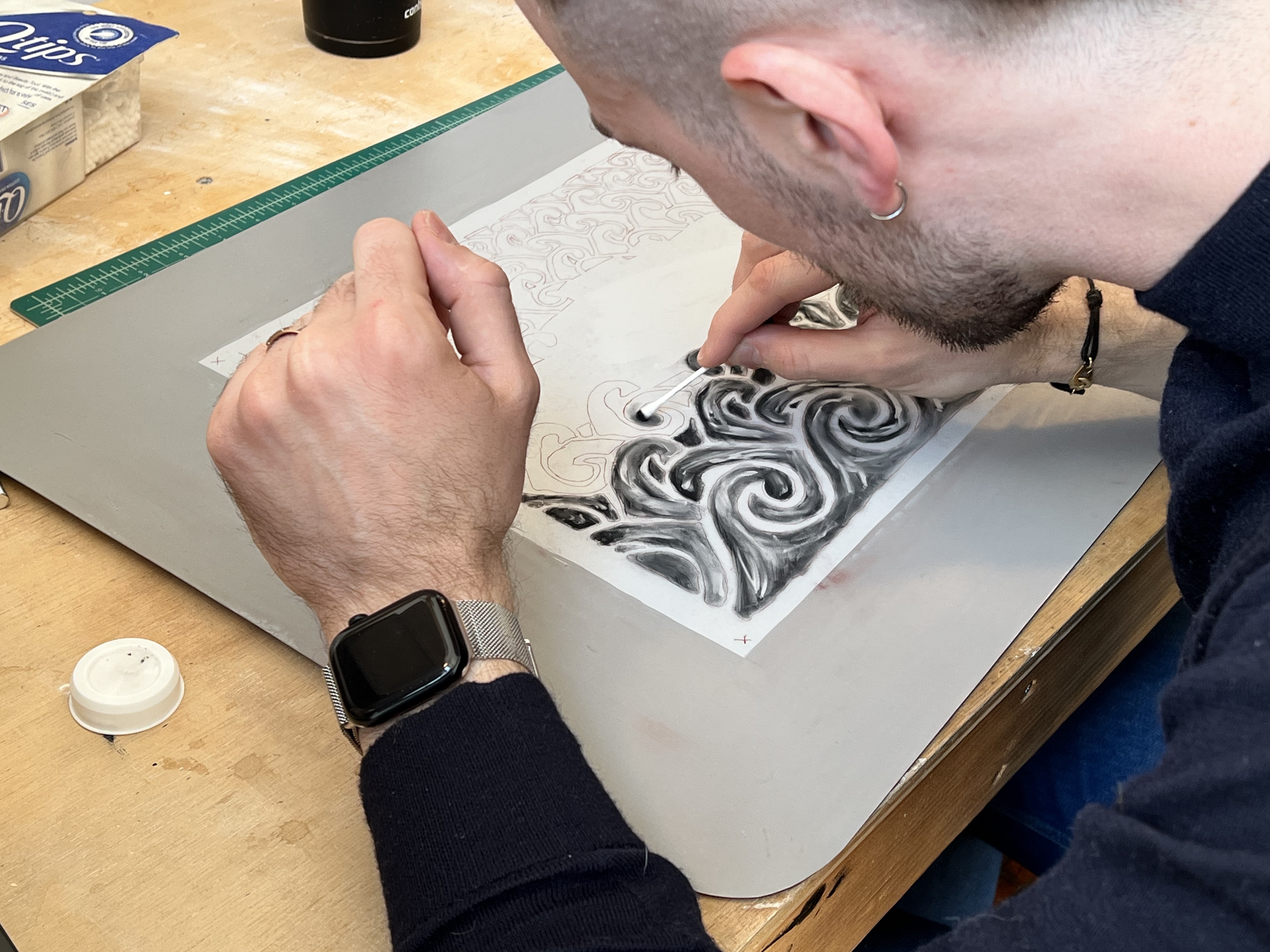 Much of Lefebvre’s work is experimental and pushes boundaries both narratively and technically. In a new print in progress, he uses printer toner as one element of a contemporary lithographic process. In slow strokes with a Q-tip, he applies subtle tones of blacks and grays to achieve a painterly effect on his plate. Emerging from his labor, one finds rhythmic and exacting waves that set off the geometric form of a Coast Guard cutter.