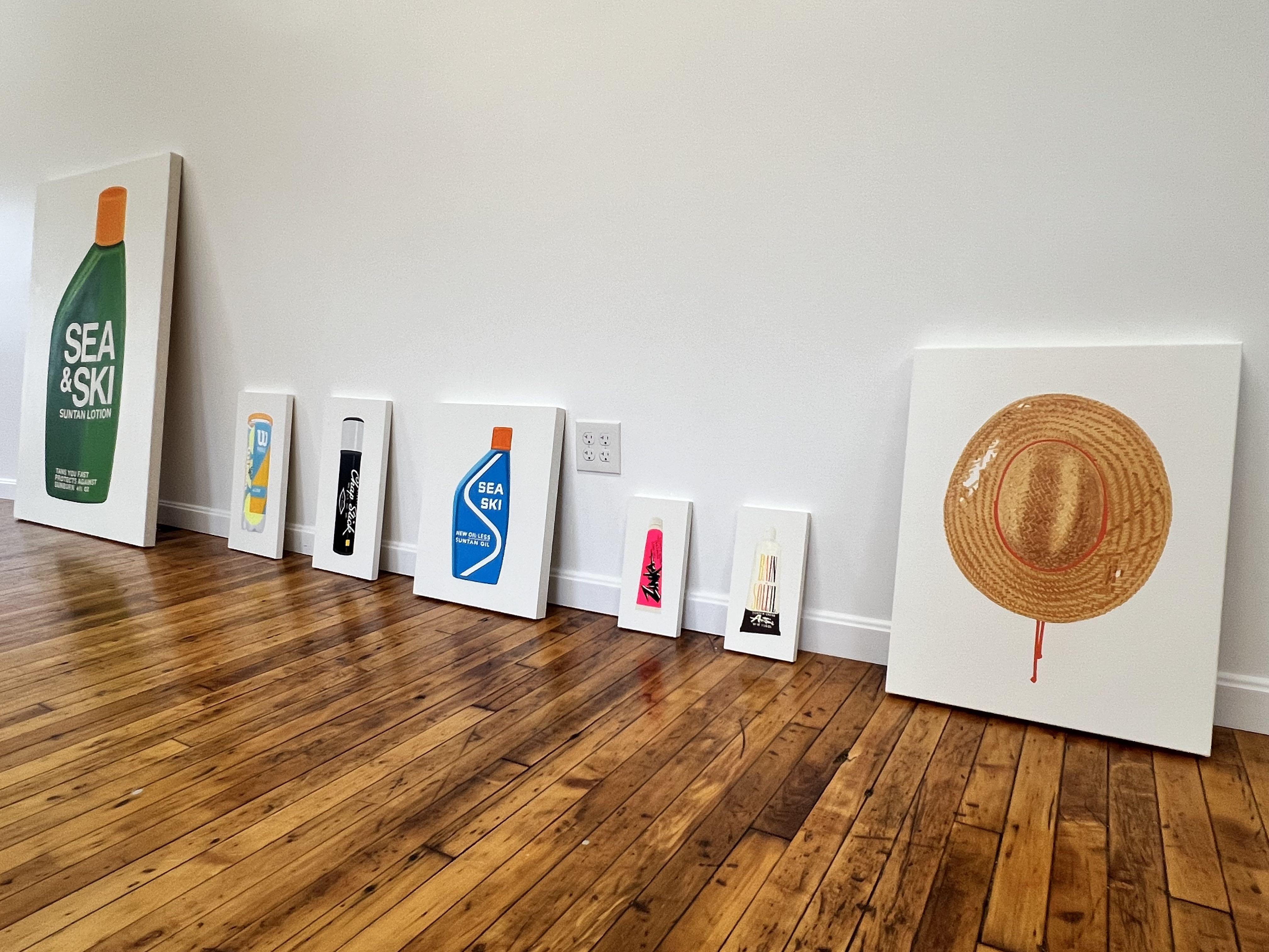 The paintings for the artist’s show in Newport will focus on themes that she has returned to repeatedly. Summer is an undergirding influence in her art. The fresh bright light and the sleek apparatuses of fun that accompany the season are central to Duke’s work. There are paintings, prints, and shaped panels that take on a sculptural quality. Beach hats, towels, and bottles of sunscreen show up in the art and beckon the viewer to the coast.