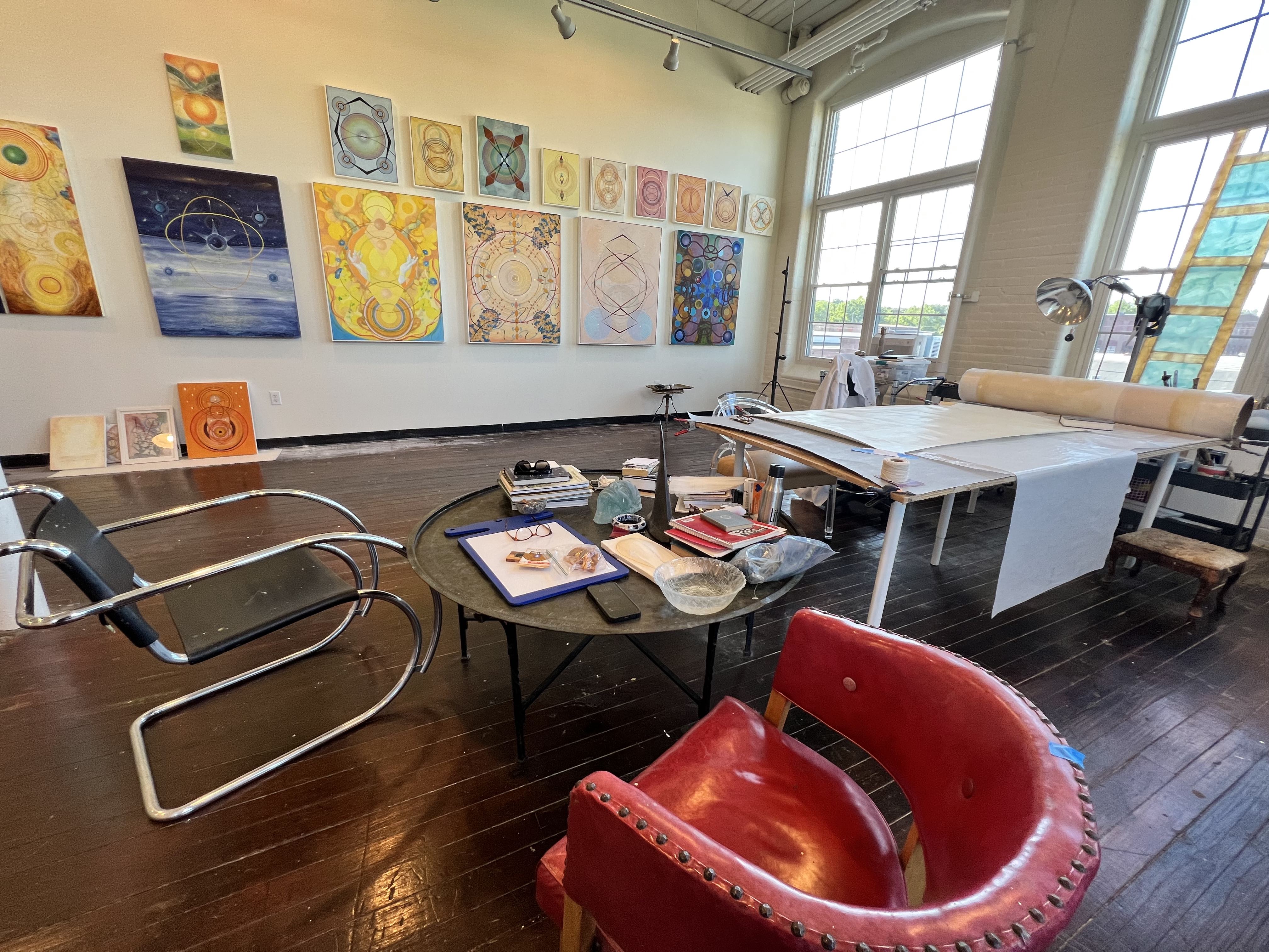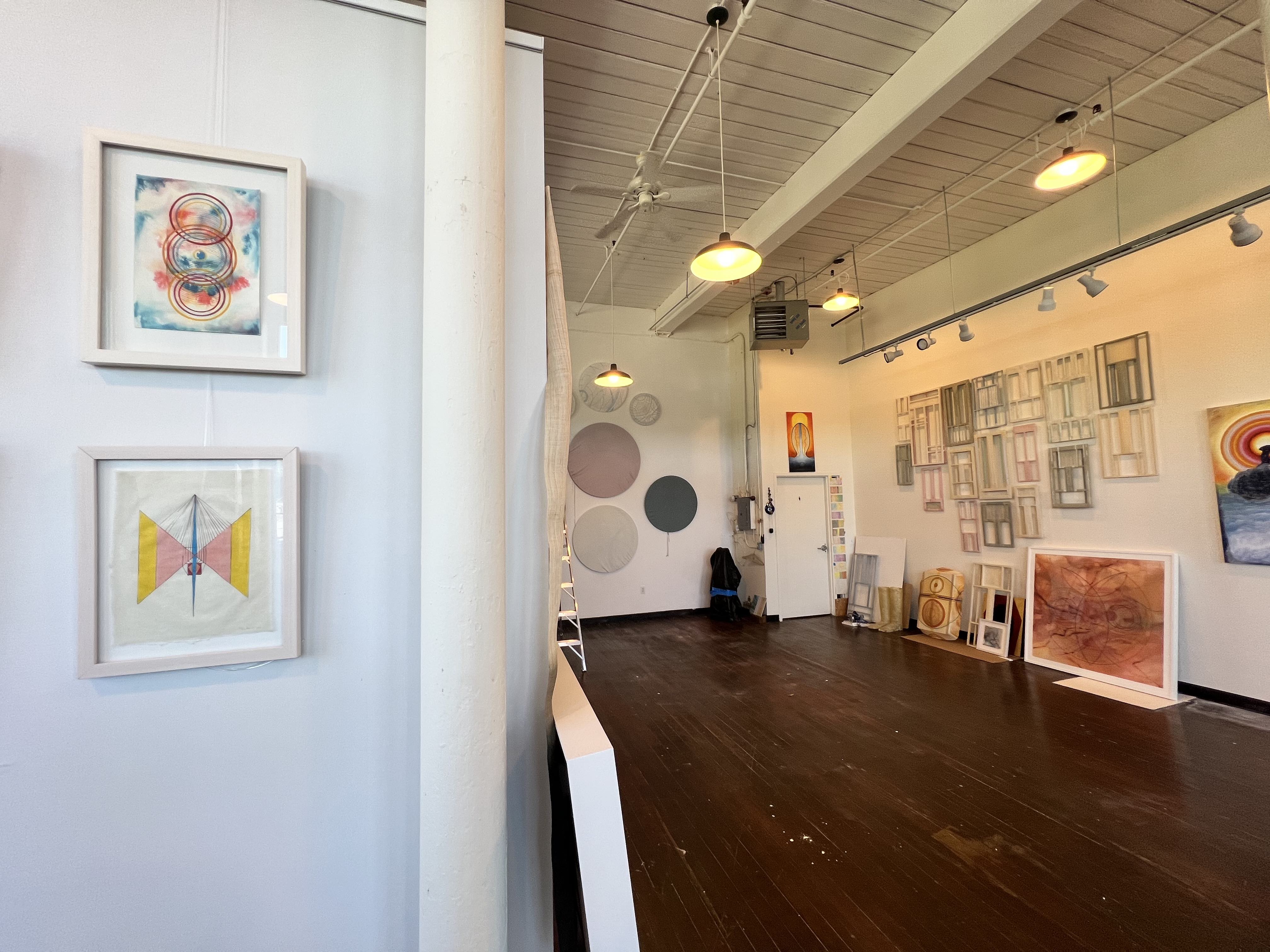 Looking at Heuser’s paintings spread across a long wall in her studio, one finds throughlines like an interest in craftsmanship and design, as well as her unique visual vocabulary of line, shape, and form. Materials like inks, oils, acrylics, gouache, and gold leaf are employed expertly, creating subtle images that have broad appeal. Beyond painting, Heuser has also made drawings, sculptures, works of printmaking, and exquisitely made sculptural works rendered in paper.