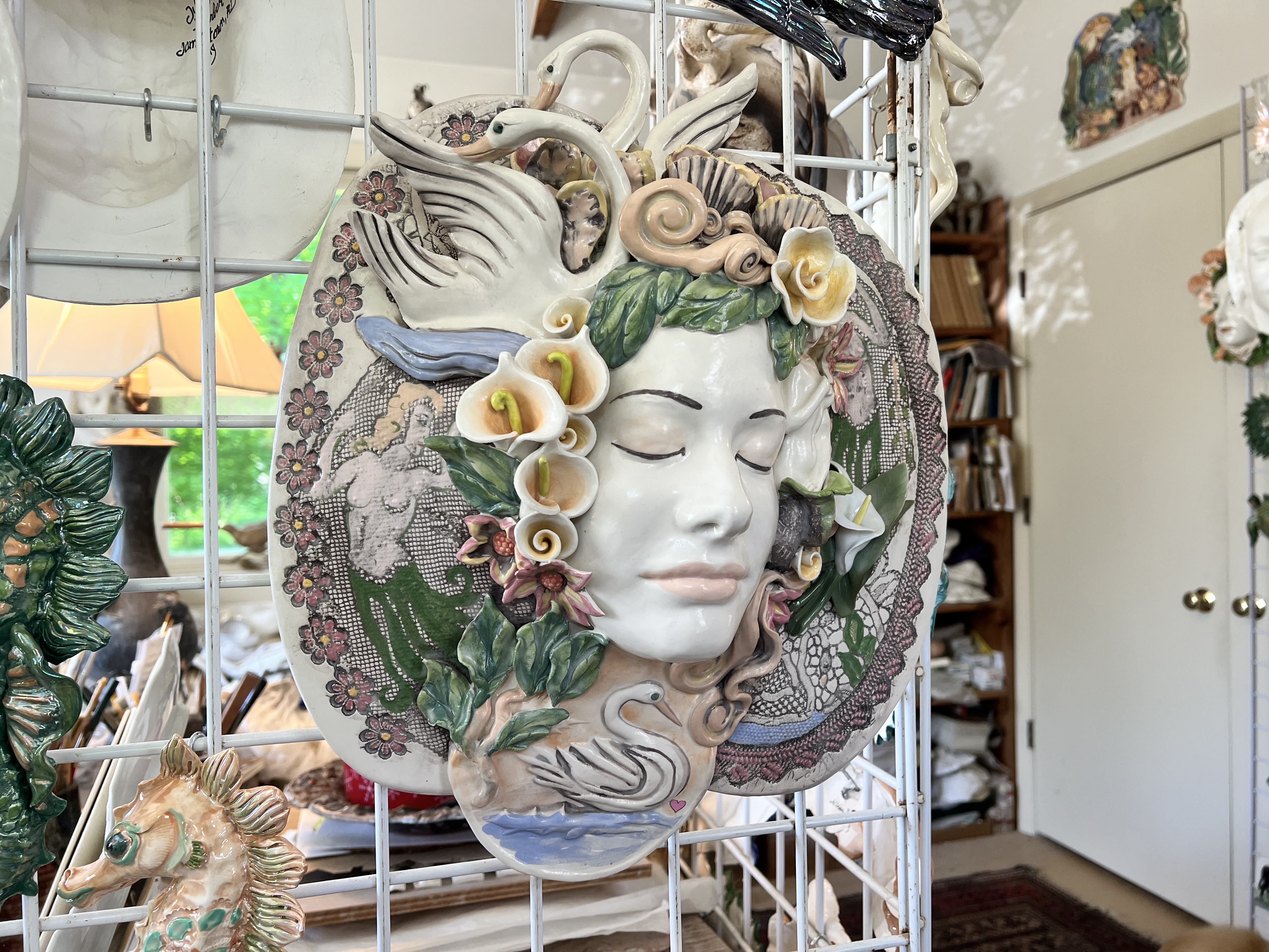 Reflecting on her love of the clay medium, Barber explains that her many years of experience with ceramics have added to her dexterity. She says, “Working with clay is second nature to me. We know each other well. When I go into the studio with the thought of creating a winged creature, the form grows and comes to life as if by magic. Clay lets me manifest visions.” In her creative space, every surface is covered with reference materials, tools, or completed works. The room is also festooned with ribbons and plaques she has received throughout her career.