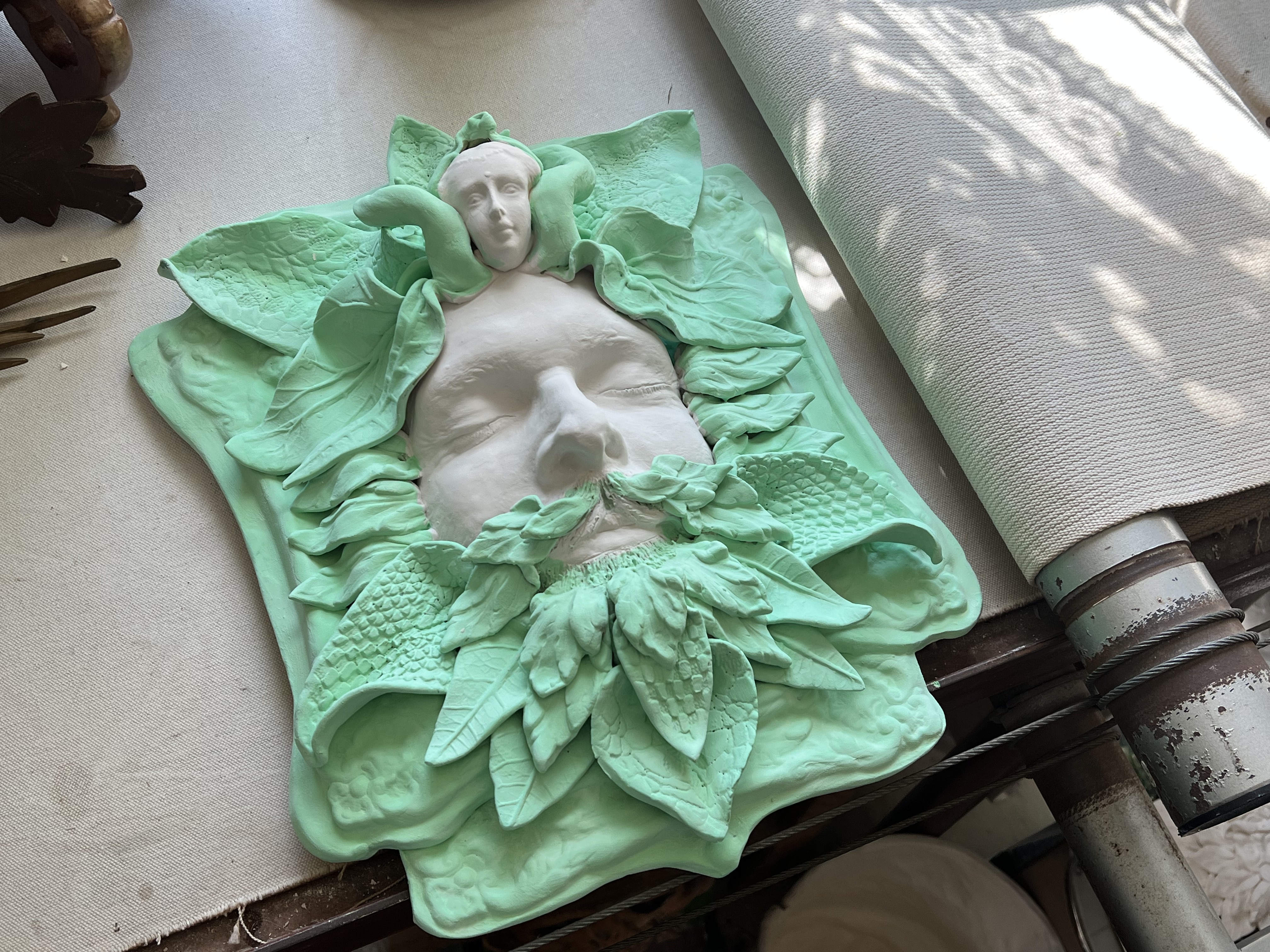 Looking forward, Barber is not slowing down. She is currently in production mode and has ideas for new and additional projects that combine her expertise in clay with her talents in photography. She explains, “My next phase is getting ready for my 29th Wickford Art Festival on July 12 and 13. I will have new sea creatures, masks, jardinieres, and of course, merpeople. I have ideas for new Grande Heads. I want to hand-color some family photographs and also start the mask/photo project of Jamestowners with their portrait masks.”