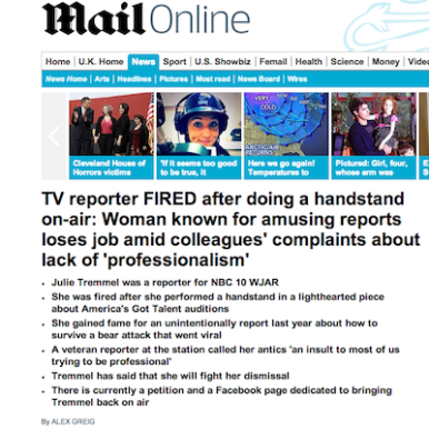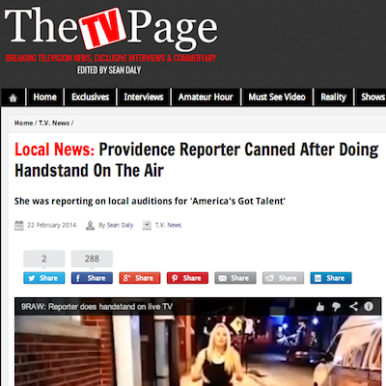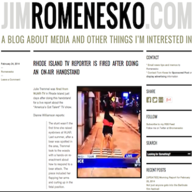 Jim Romenesko is a Midwestern journalist who runs one of the most popular blogs on media and politics amongst industry insiders. He deemed the story significant enough to garner attention on his site, posting a story on Tremel Monday entitled "Rhode Island TV Reporter is Fired After Doing Handstand on Air." Romenesko updated the story to include his favorite comment that someone had posted on his Facebook page in response to the story on the firing: "If you send your reporter out to shill for your network’s TV show, there really is no standard low enough to define a firing offense."