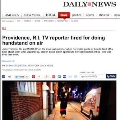 New York's Daily News is world famous for their tart headlines and coverage. They hopped on theTremmel story soon after it broke on GoLocal, knowing it was not to be missed. Their article, "Providence, R.I. TV Reporter Fired For Doing Handstand on Air," ran Thursday, replete with pictures and GIFs of Tremmel and her bear safety video.
