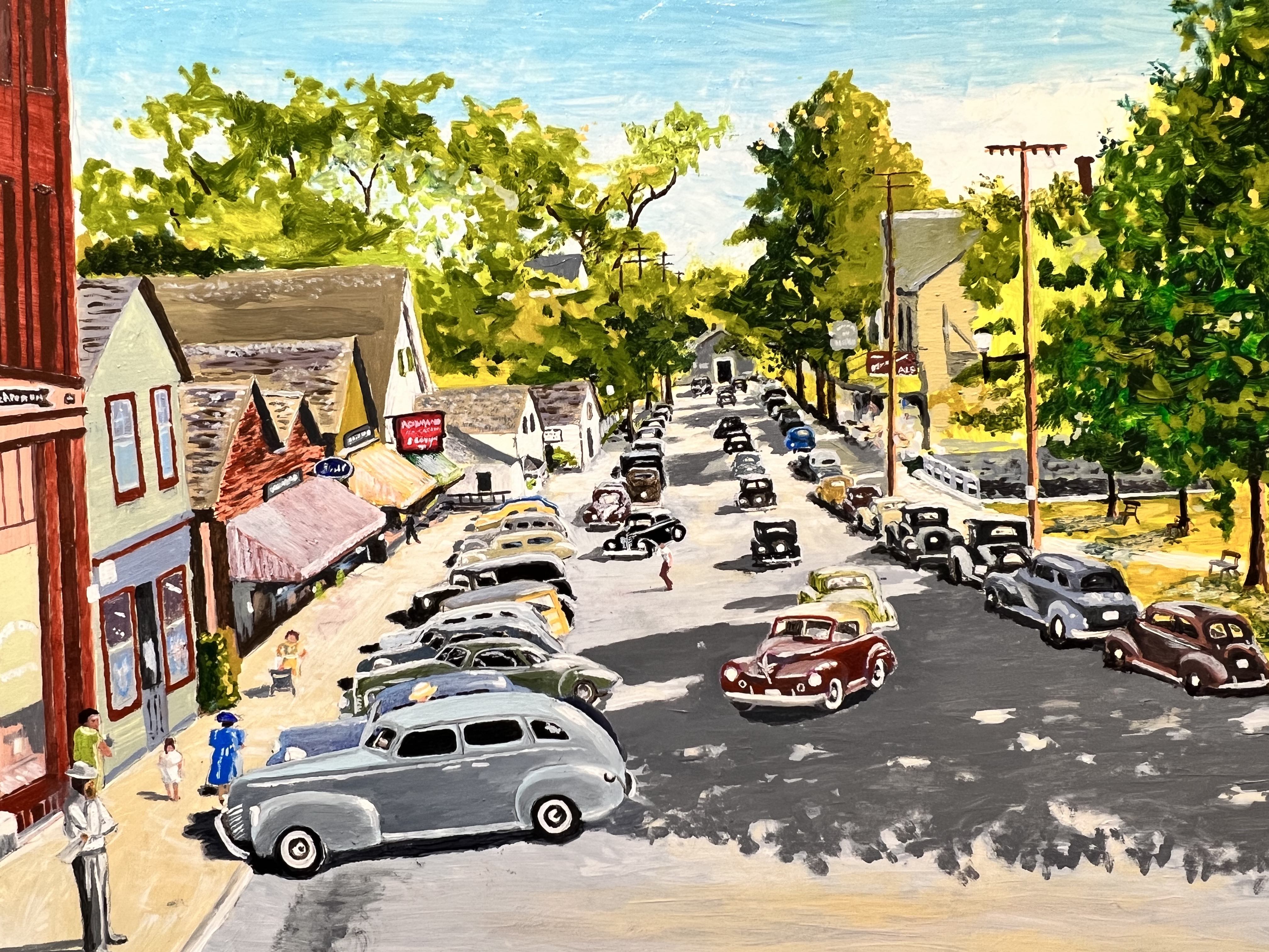 There are also plenty of paintings on view in Wickford’s current show. Some of these are quite traditional, like Vincent DelBuono’s “Wickford Village, 1940”, which pays tribute to the quaint and charming quality of the place that gives the Association its name. In his painting, the main street of the town is lined with vintage automobiles and colorful shopfronts, reminiscent of simpler times. Charles Barbour’s still life of white peonies is the epitome of classical realism and uses skillful treatment of light and shadow to push its subject into the viewer’s space.