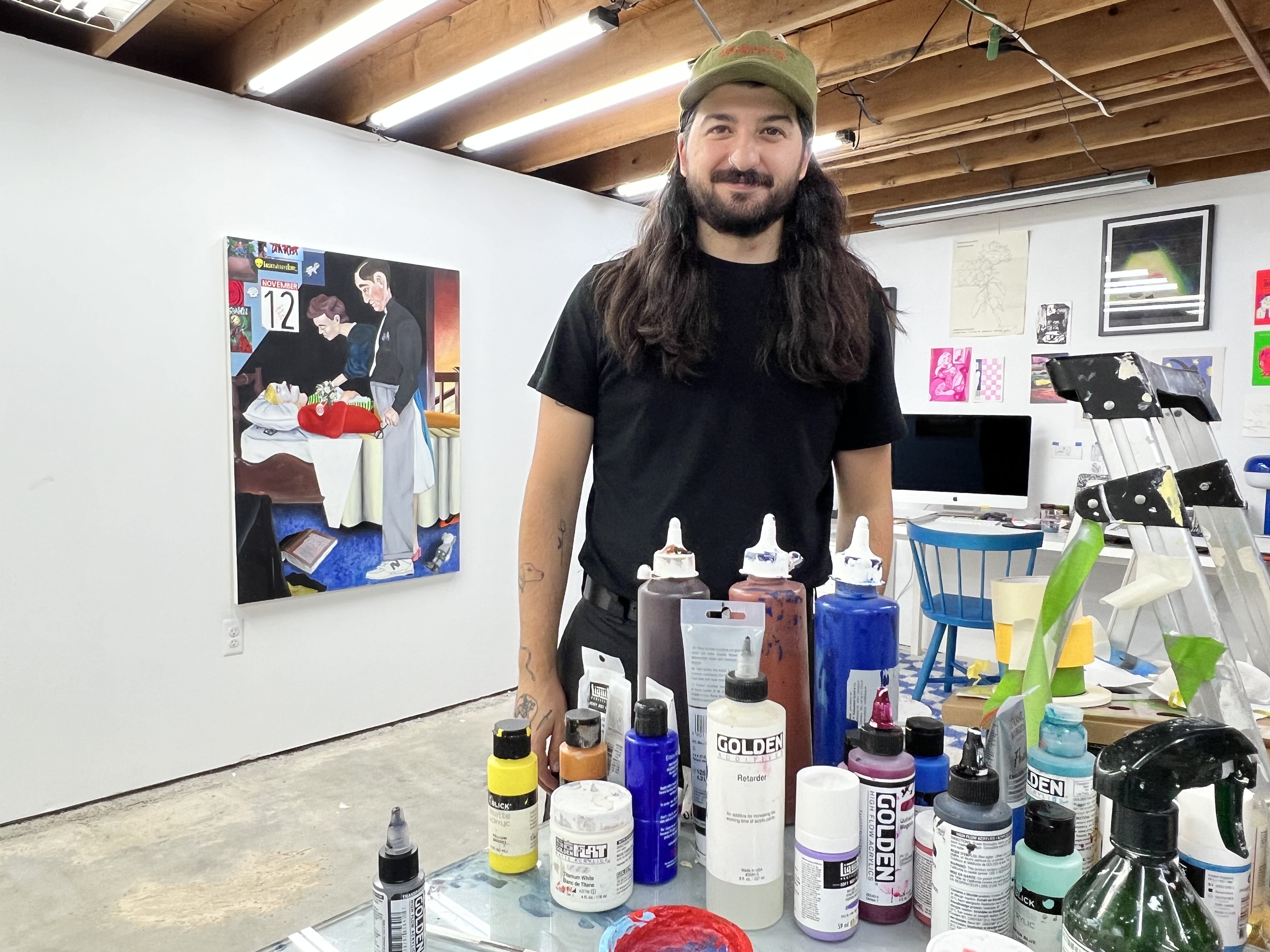 Artists are always creating new pieces and Providence painter Brandon Aguiar is currently in the process of creating a fresh body of work. From his productive studio space, he is making artworks that explore art history and pop culture with a sense of humor and creativity. One of a younger generation of painters with a passion for novel forms of representation, Aguiar also experiments with abstraction and split picture planes. To make his work, he uses methods from traditional applications of acrylics and oils, to other techniques like masking and airbrushing.