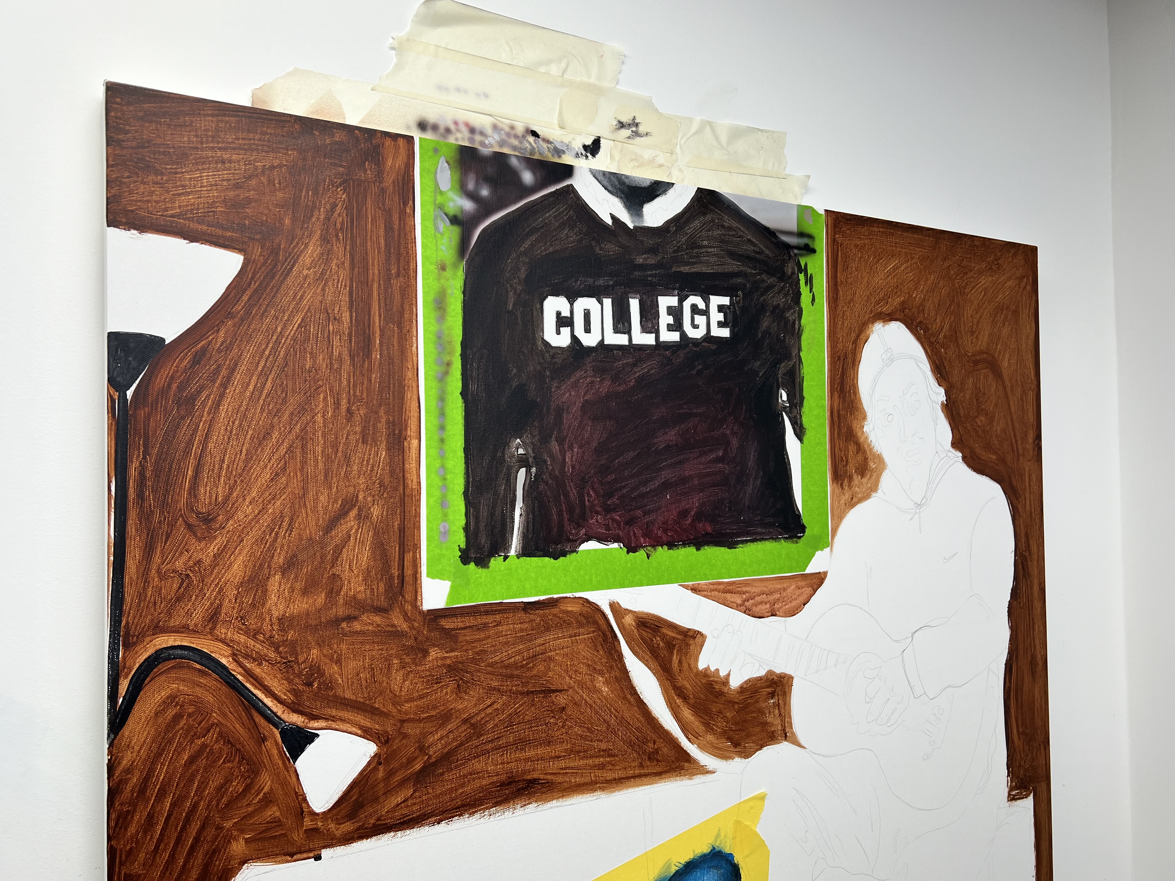 In his studio, Aguiar crafts his latest paintings in multiple steps. First, he constructs Photoshop collages on his iPad. These often draw imagery from the canon of art as well as from contemporary media. In one image, he combines disparate elements like a poster for the film “Animal House” with a guitarist plucked from an Old Master. Using this collage as a reference point, he creates large-scale paintings. He does not hold to his reference entirely but uses it as a jumping-off point to stitch together an original work of art that combines all kinds of sources. The work is that of a researcher.