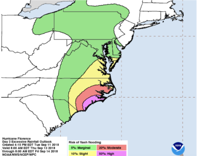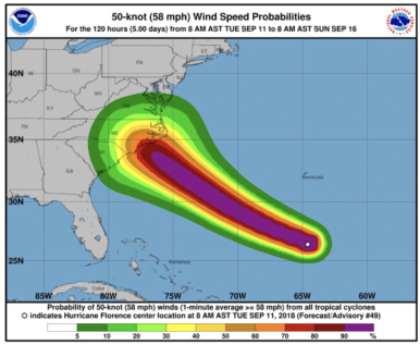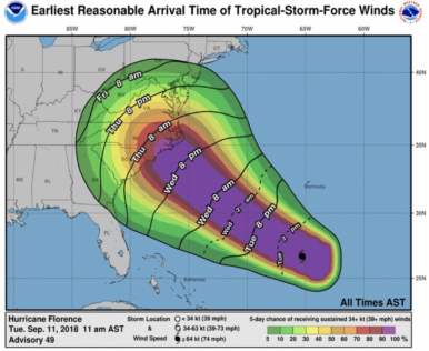 “Florence is likely to produce a life-threatening storm surge along the coastlines of South Carolina, North Carolina & Virginia, and a Storm Surge Watch is in effect for a portion of this area,” said the National Hurricane Center.