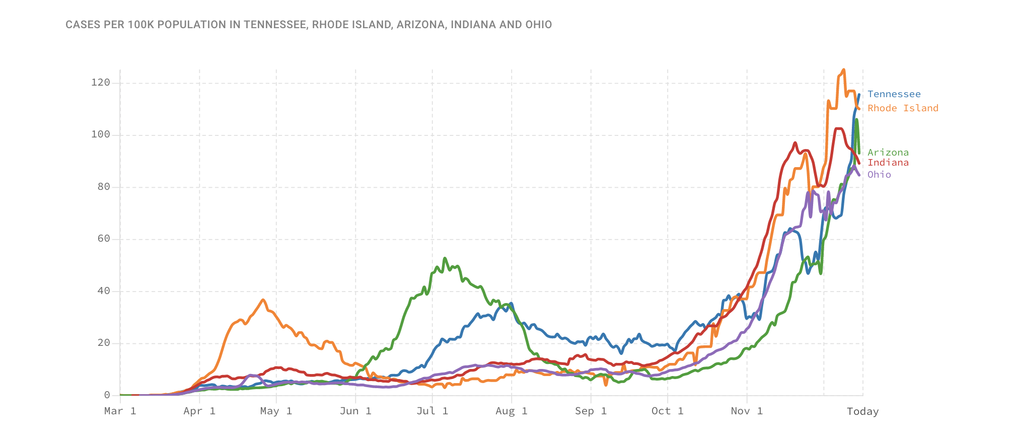 After more than a week, Rhode Island was surpassed by Tennesse for having the highest number of cases per capita. Tennessee's new top slot ranking was more about their growth in cases rather than Rhode Island decreasing infection.