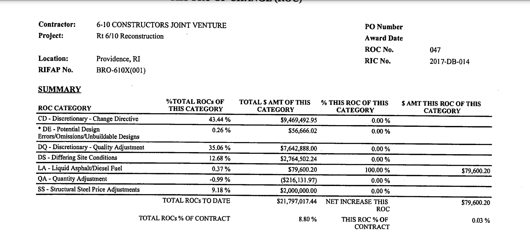 GoLocal has secured nearly 80-pages of documents that show that in the 6/10 construction project, the contractor submitted and received approval for more than $21 million in change orders from the beginning of the project thru August of 2021.