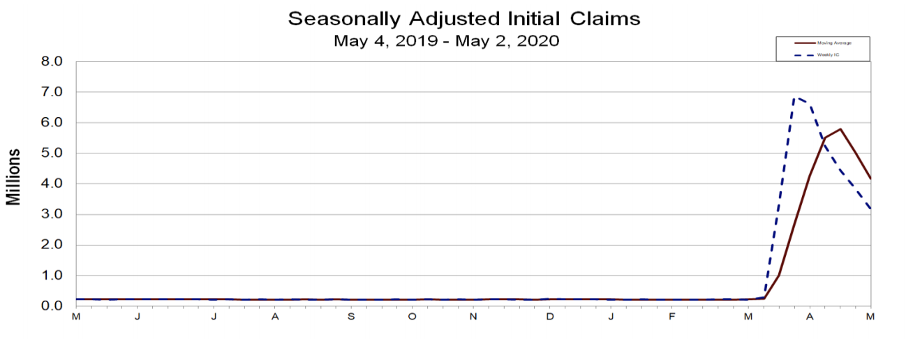 In the week ending May 2, the advance figure for seasonally adjusted initial claims was 3,169,000, a decrease of 677,000 from the previous week's revised level. The previous week's level was revised up by 7,000 from 3,839,000 to 3,846,000. The 4-week moving average was 4,173,500, a decrease of 861,500 from the previous week's revised average. The previous week's average was revised up by 1,750 from 5,033,250 to 5,035,000.