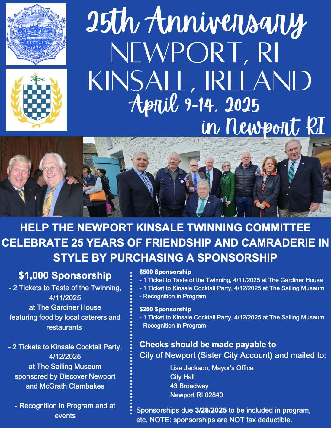 The “Newport Kinsale Twinning Committee,” which is in its 25th year, has recently been appealing to the community to help underwrite events taking place in Newport this April.