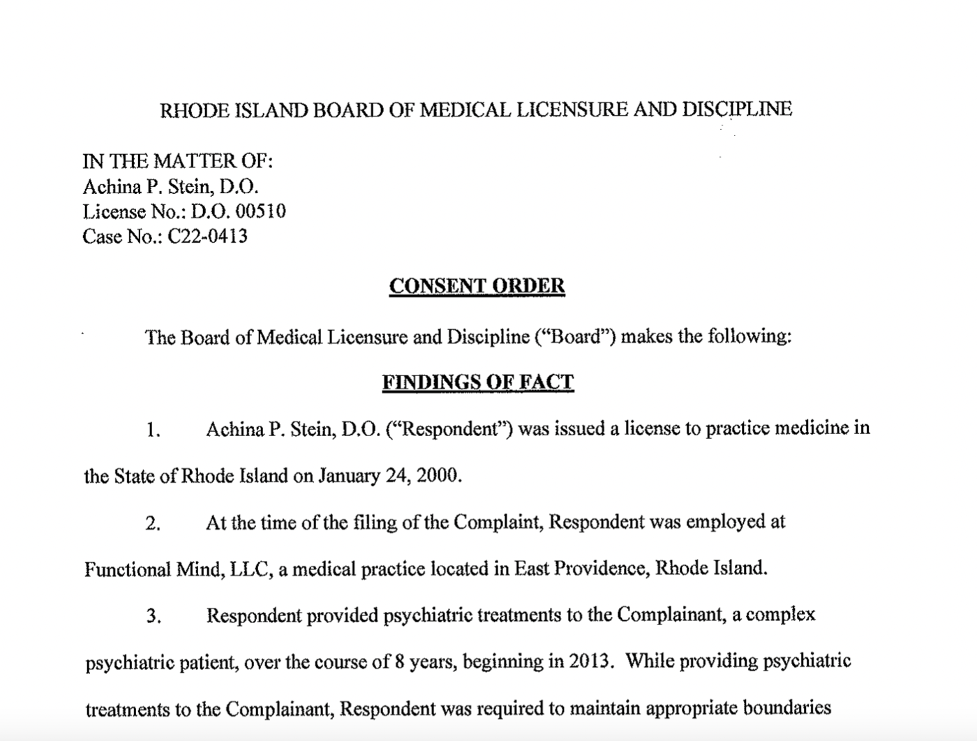 According to the consent order, Stein provided psychiatric treatments to a “complex psychiatric patient” over the course of 8 years beginning in 2013.