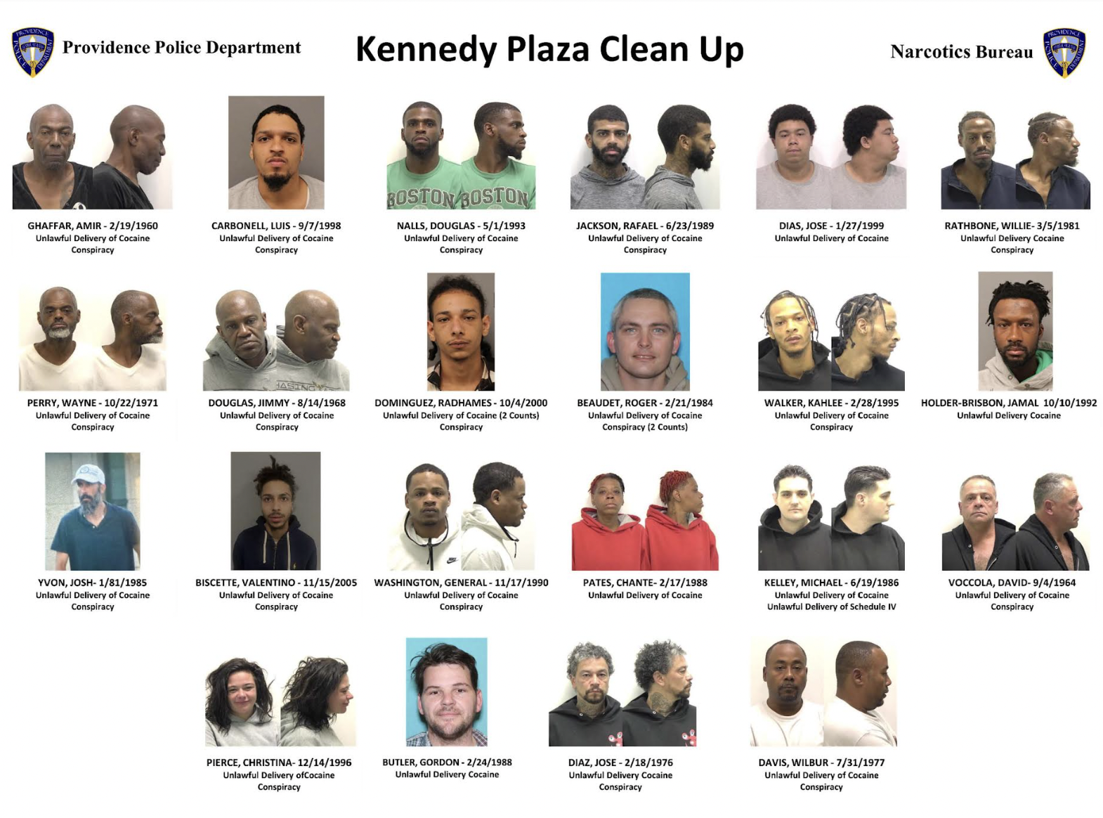 Providence Police announced Monday that following “a month-long investigation, the Providence Police Department obtained 22 arrest warrants for individuals involved in the organized possession and distribution of illegal narcotics in the Kennedy Plaza area.”