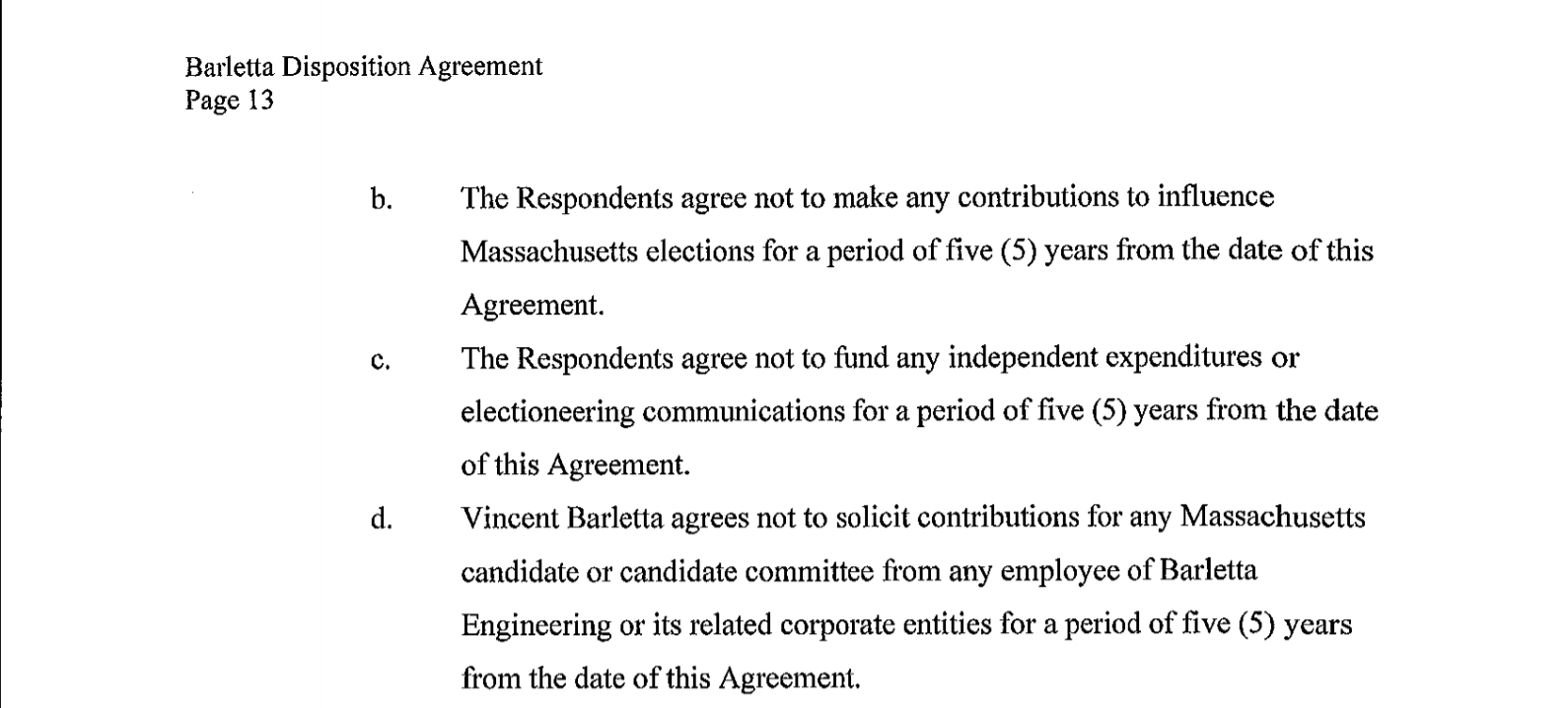 And the agreement stipulated further, "The Respondents agree not to make any contributions to influence Massachusetts elections for a period of five ( 5) years from the date of this Agreement. The Respondents agree not to fund any independent expenditures or electioneering communications for a period of five ( 5) years from the date of this Agreement. Vincent Barletta agrees not to solicit contributions for any Massachusetts candidate or candidate committee from any employee of Barletta Engineering or its related corporate entities for a period of five (5) years from the date of this Agreement."
