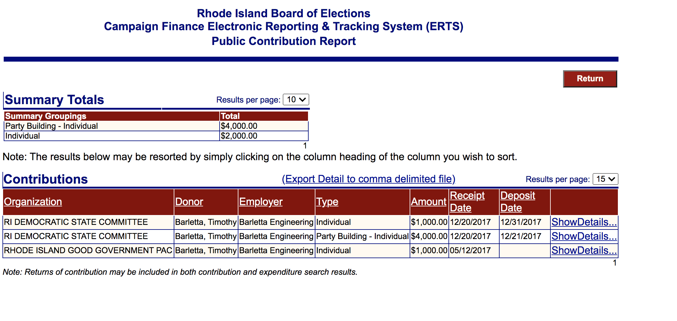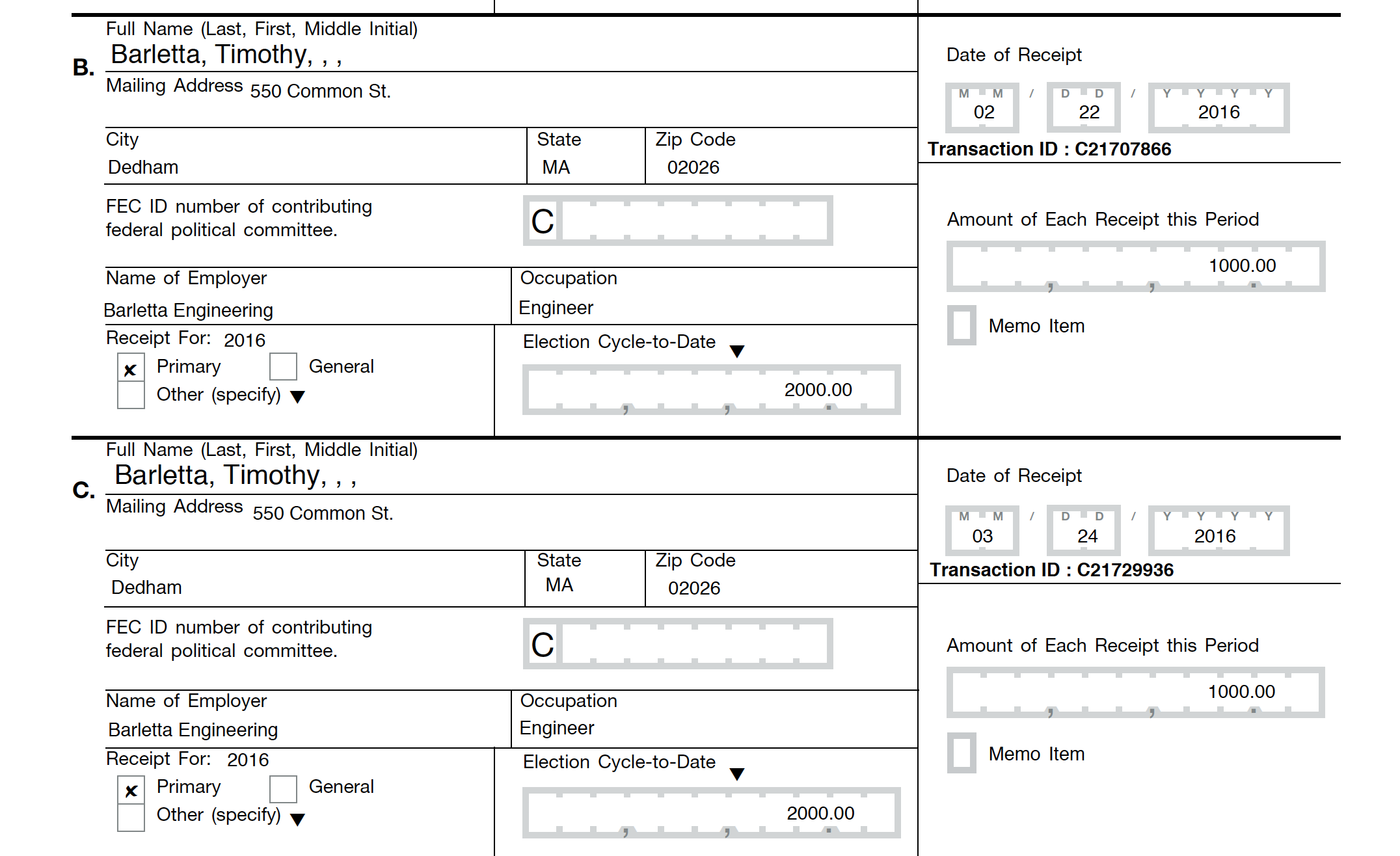 Not only did Timothy Barletta list his employer as Barletta Engineer in connection with the donations to the Rhode Island Democratic Party in December 2017, but he also listed Barletta Engineering in another Rhode Island donation to a Democratic PAC, as well as on multiple federal campaign donations in the past few years.
