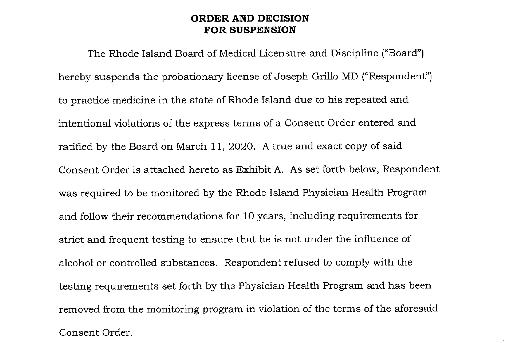 This week, RIDOH summarily suspended the medical license of Dr. Joseph Grillo for “his repeated and intentional violations of the express terms of a Consent Order entered and ratified by the Board on March 11, 2020.”