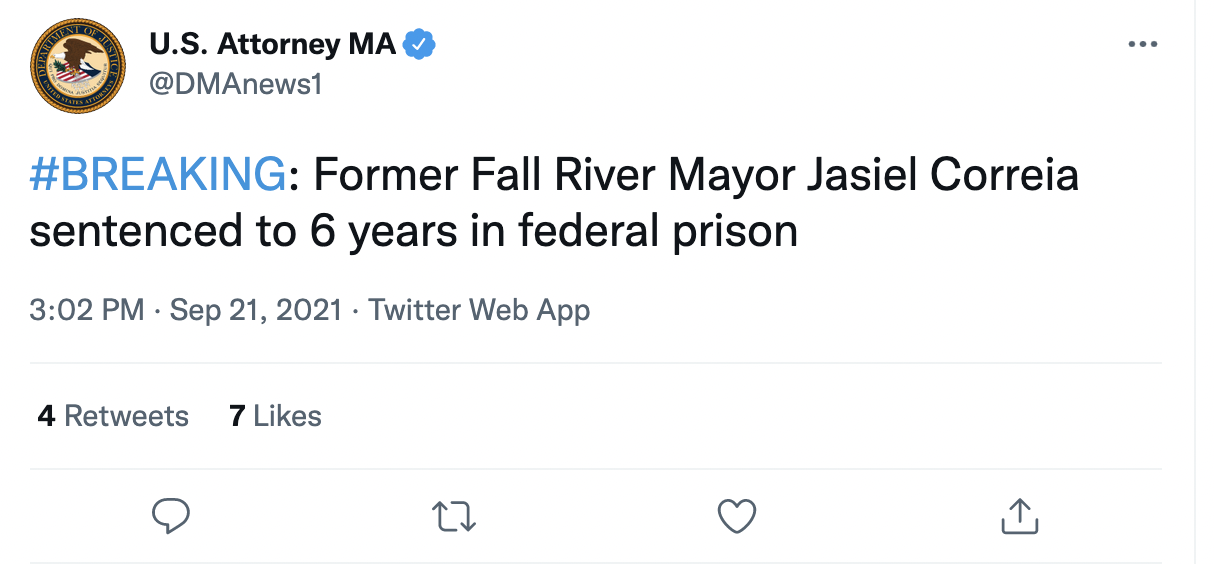 The Boston office of the U.S. Attorney's office tweeted at just after 3 PM, "#BREAKING: Former Fall River Mayor Jasiel Correia sentenced to 6 years in federal prison."