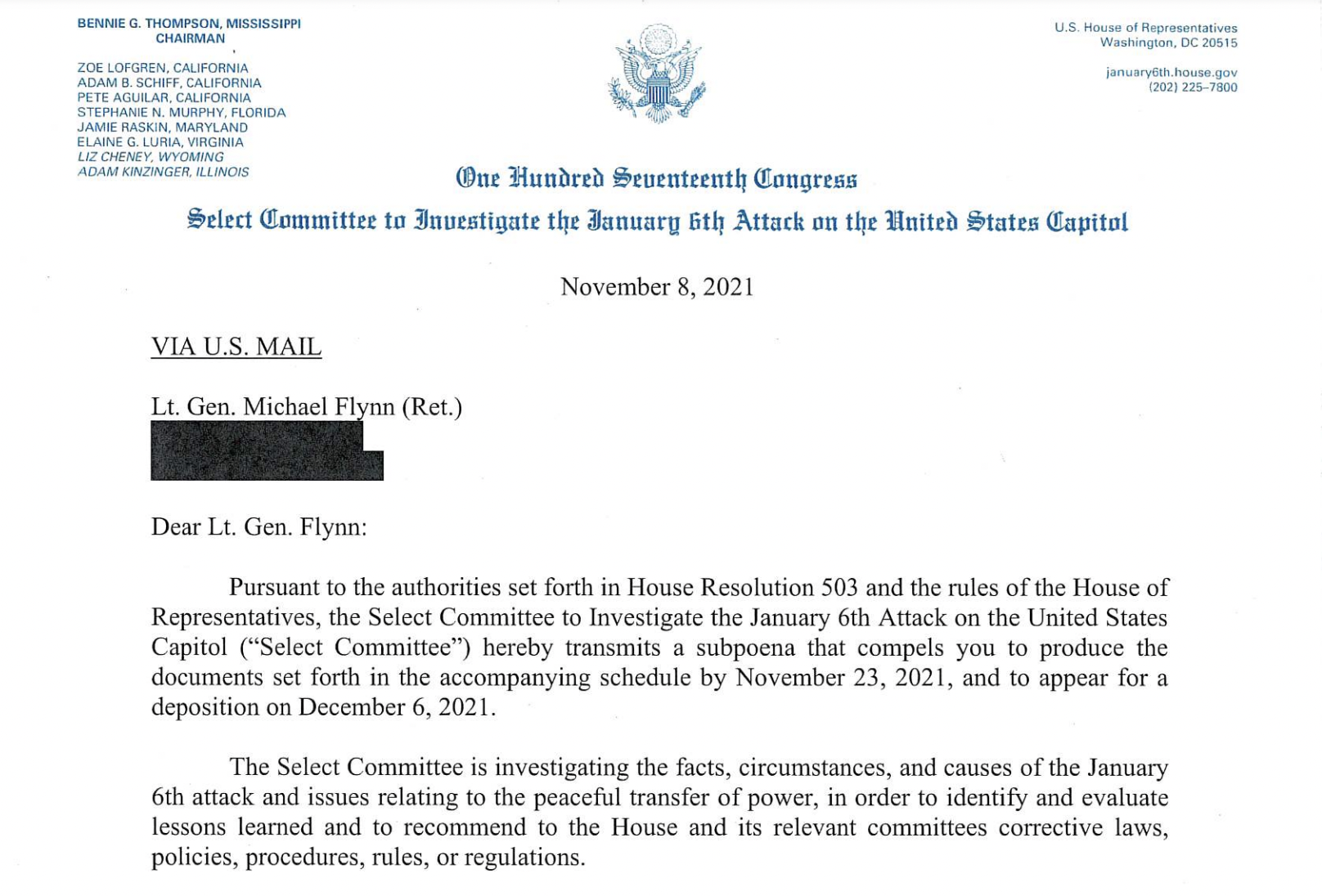 Chairman Bennie G. Thompson on Monday announced that the Select Committee has issued subpoenas to Flynn and five other high profile Trump associates involved in efforts to promote false claims of election fraud or overturn the results of the 2020 election. The Select Committee is demanding records and testimony from witnesses including staff members of the former President’s campaign and individuals associated with the so-called “war room” that drove efforts to halt the counting of electoral votes in the runup to the violence of January 6th.