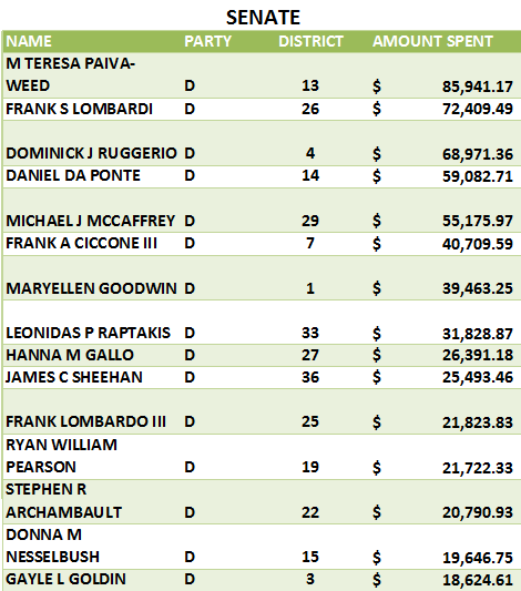 GET THE LATEST BREAKING NEWS HERE -- SIGN UP FOR GOLOCAL FREE DAILY EBLASTSenate President M. Teresa Paiva Weed is second on the list of the state’s biggest spenders at $85,941.17. Her long shot Republican opponent, Geoffrey William Cook, has only reported spending $11.99 in 2012.