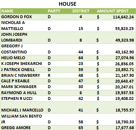 Leading the way is House Speaker Gordon Fox, who spent $114,642.24 between Jan. 1 and Oct. 30. Speaker Fox, who faces a challenge from Independent Mark Binder, has spent more than double any other candidate for the House of Representatives, including $45,209.04 last month alone. Binder, who has been highly critical of Fox’s handling of the 38 Studios loan guarantee, has spent less than $11,000.