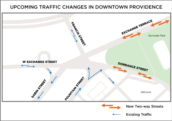 Traffic will become two-way traffic at the second half of Exchange Terrance as well as on Dorrance Street, from Fountain Street to Washington Street.