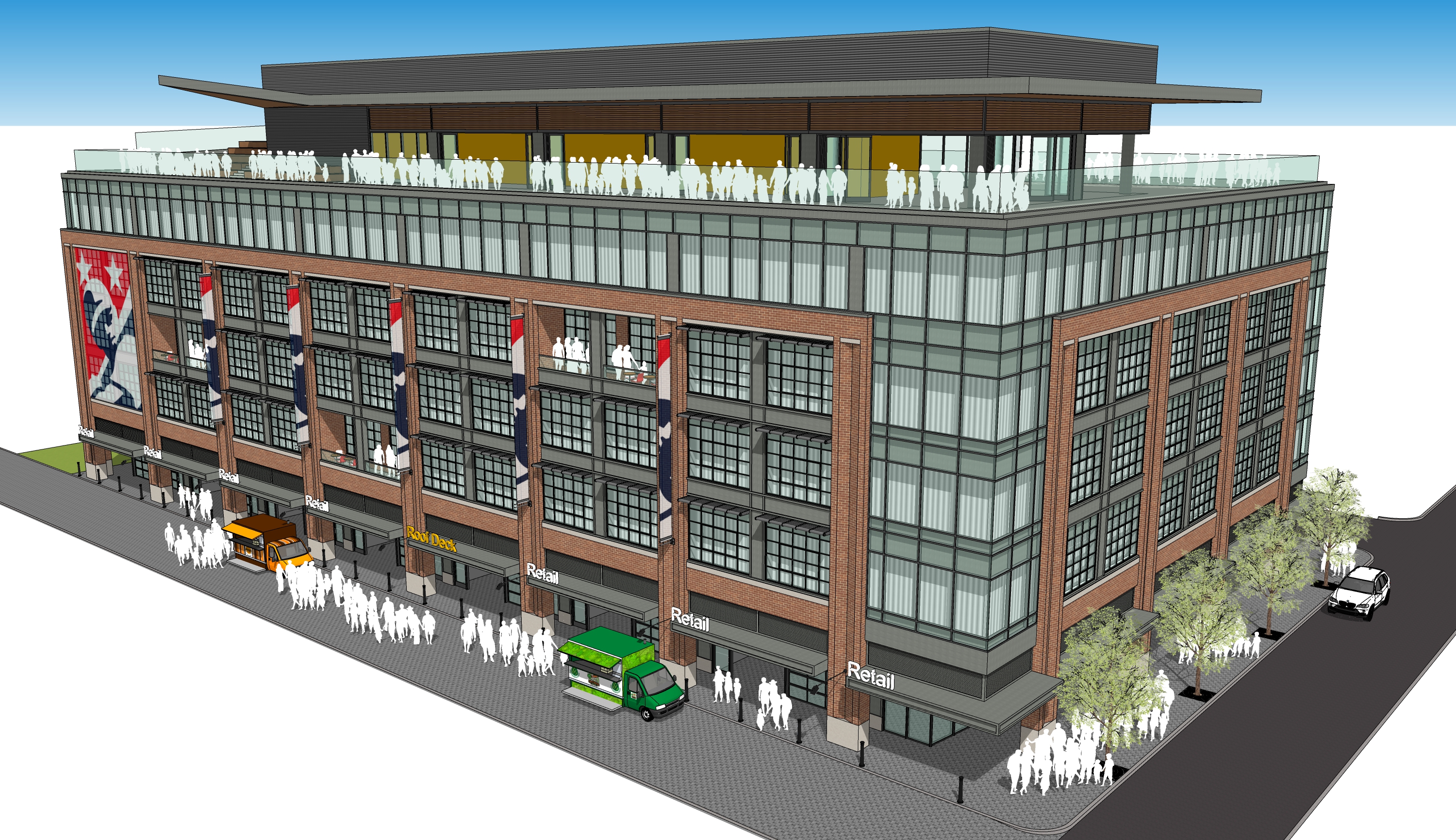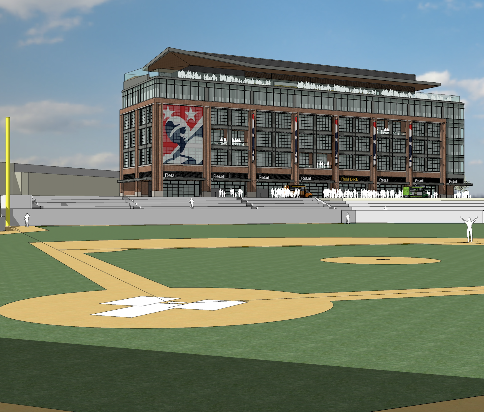 The property will sit above an underground parking garage and include a roof deck and retail space overlooking the playing field.