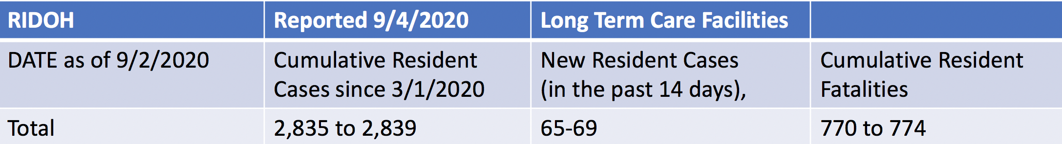 On Friday, the Rhode Island Department of Health (RIDOH) updated data for the first time in 7 days and the numbers showed a 44% increase week over week in nursing homes in the number of infections — rising from "45 to 49" to "65 to 69." RIDOH reports offer ranges for the number of cases and deaths when reporting data, rather than exact numbers due to federal privacy laws.