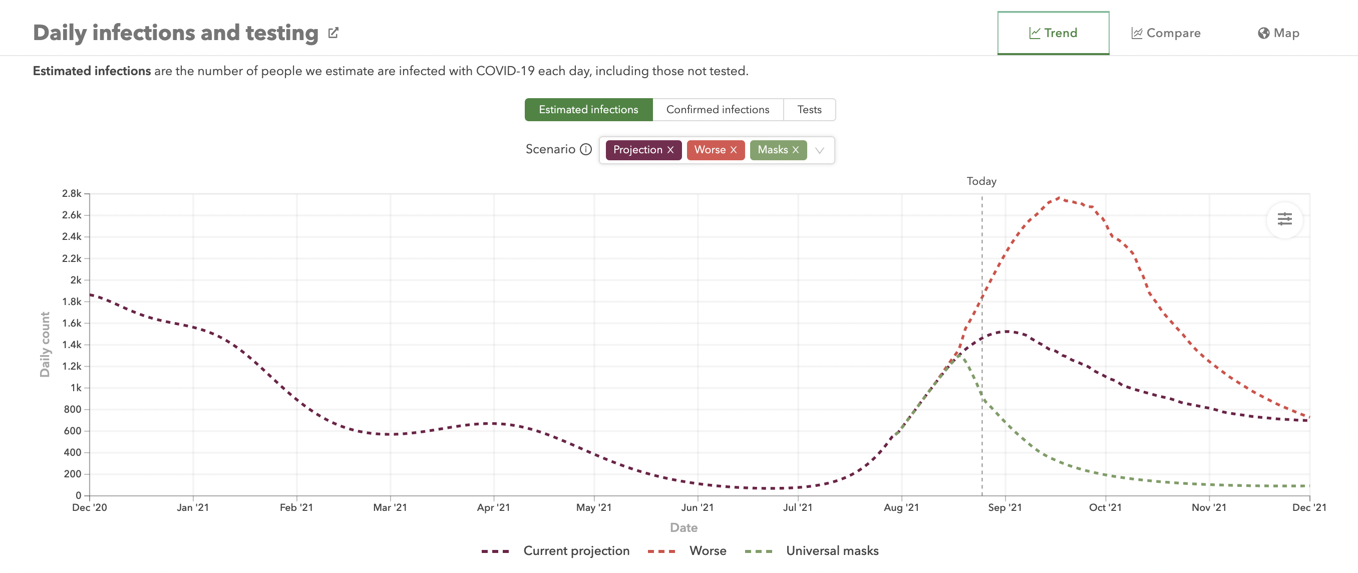 The Institute for Health Metrics and Evaluation (IHME) is an independent global health research center at the University of Washington. They have developed a mathematical forecasting model to project COVID infections, deaths, and hospitalizations. They have recently updated their forecast models to include the impacts of mask-wearing.