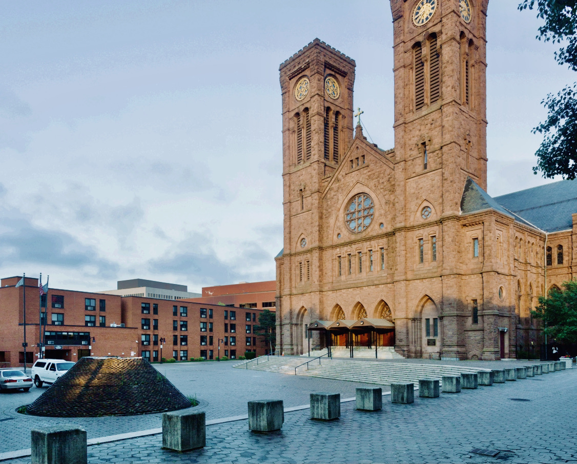 The plaza was created to enhance the Cathedral of Saints Peter and Paul, which was designed by noted Irish-American architect Patrick Charles Keely, a prolific designer of nearly 600 churches and hundreds of other institutional buildings for the Roman Catholic Church.