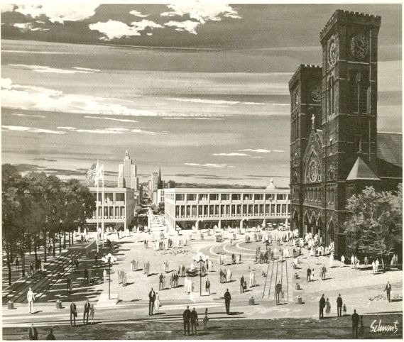 "Today, that space is a funnel through which pours the traffic of five streets. In the plan, the rerouting of automobiles to other local streets permits the formation of a pedestrian oasis, attractively paved and embellished with sculptures, a fountain, trees, and special lighting standards…Thus Cathedral Square will become the heart of the Weybosset Community; the crossing point of Westminster Mall and Jackson walkway, a lively meeting place of community activities. A well-ordered center, it will serve the multiple purposes of urban life in the proven manner of so many similar urban spaces and church squares of the cities of Europe."